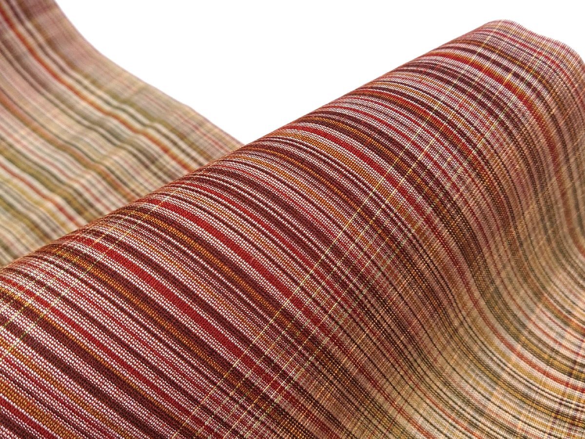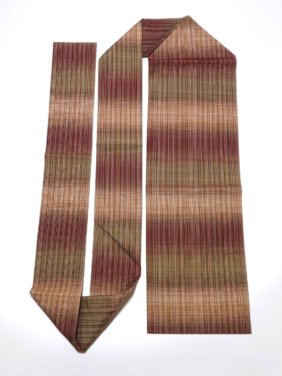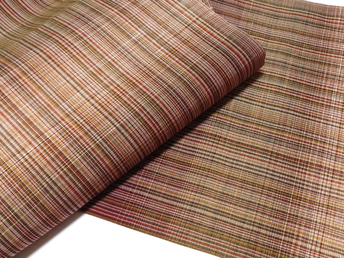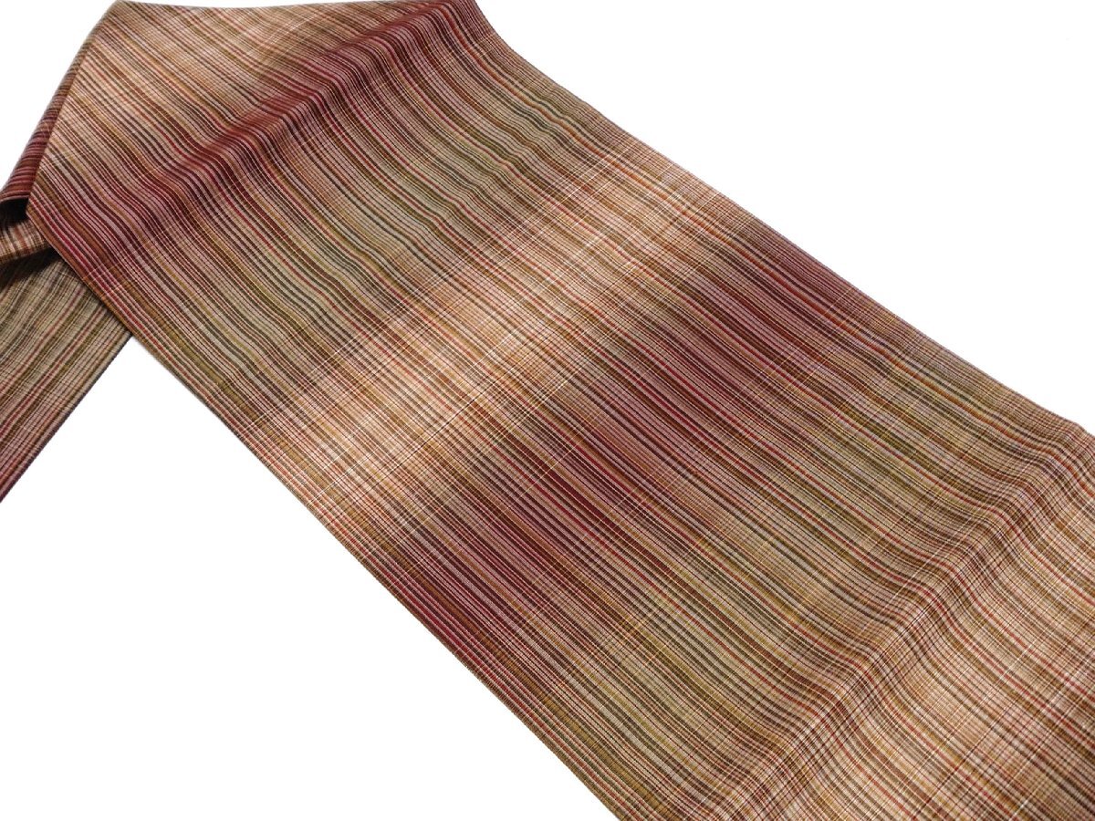 繊細な縞が幾重にも重なり合うことで、奥行きのある美しい横段を描いた洒落帯です。 細かな線が生み出す表情は軽やかで、遠目には柔らかな濃淡となって浮かび上がり、 近くで見ると複数の糸色が織りなす豊かな味わいを楽しませてくれます。 無地感覚のお着物から、ニュアンスのある紬・小紋まで幅広く合わせやすく、 日常のお出かけや街歩き、観劇や食事などのシーンにも活躍。 さりげなく個性を添えるモダンな縞柄は、大人の装いに洗練された印象を与えます。 しなやかで扱いやすい帯地のため、初めての方にも締めやすく、長時間の着用でも快適。 コーディネートに変化を出したい時の一本として重宝する名古屋帯です。どうぞお手元に。 ※撮影時部屋の照明によって画像の色に若干の差がございます。 色味に差がございますことをご了承のうえご検討下さいませ。 ※個人保管品のため記載のない僅かな難がある場合がございます。 そのような理由でのキャンセルはお受けできませんので、ご了承の上ご検討お願いいたします。 |