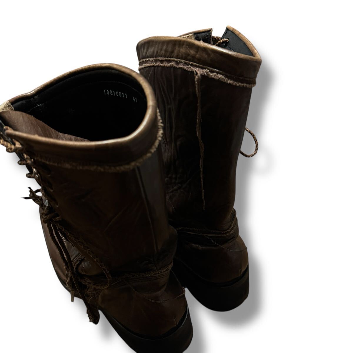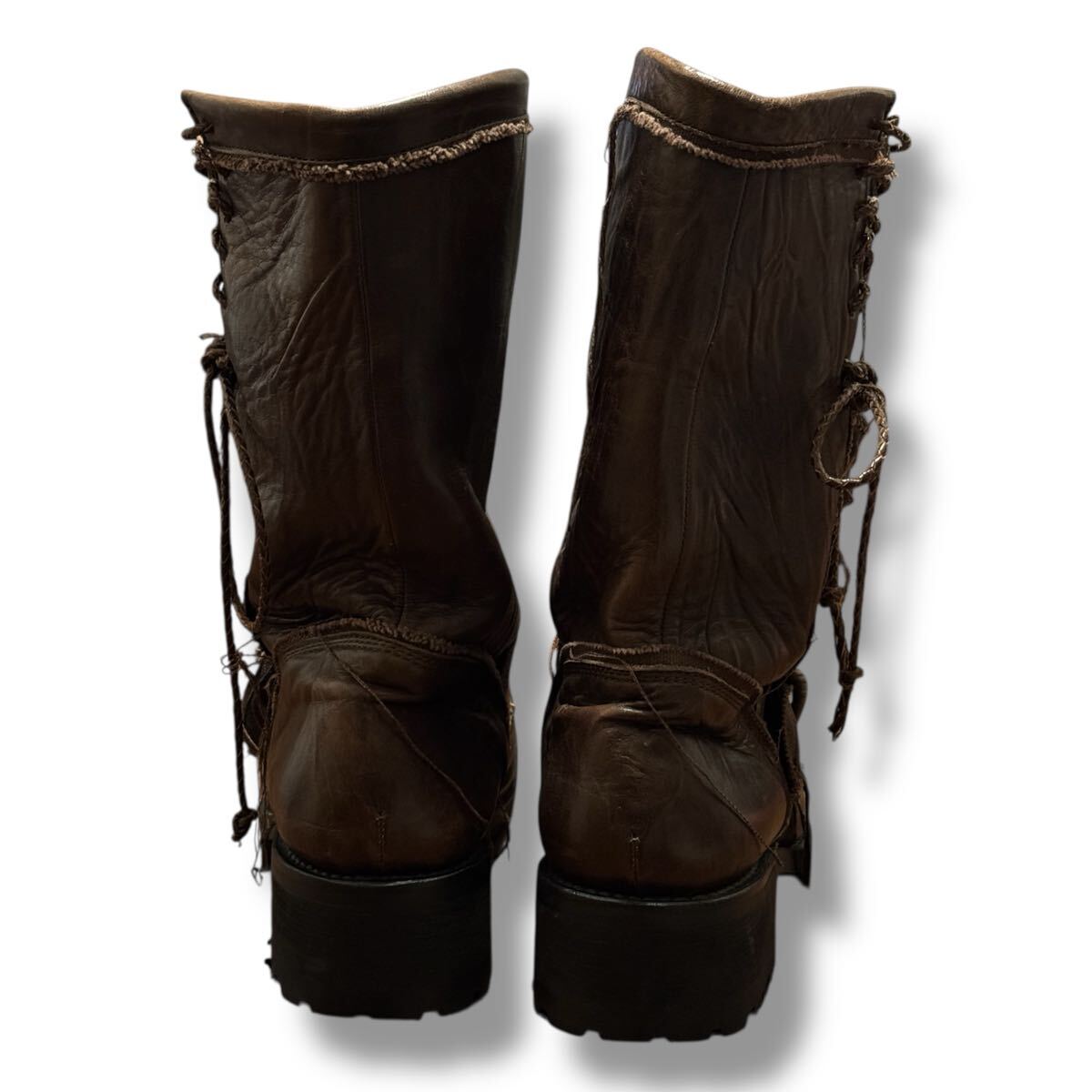深いブラウンのレザーは履きこむほど味が増すタイプで、ブーツ全体に入ったシワや風合いが唯一無二の雰囲気を演出しています。