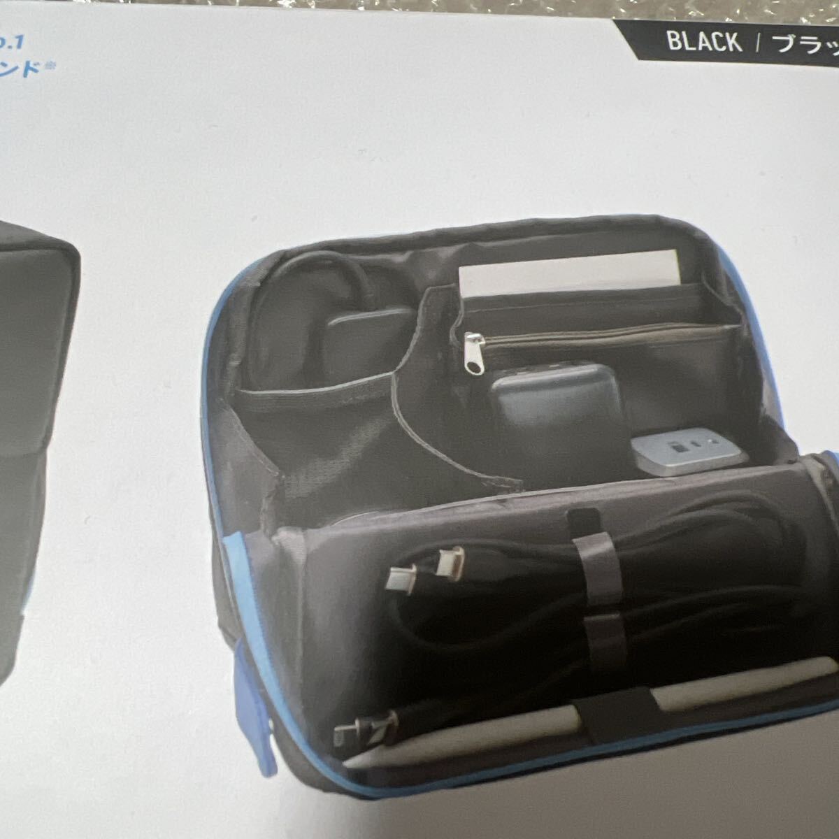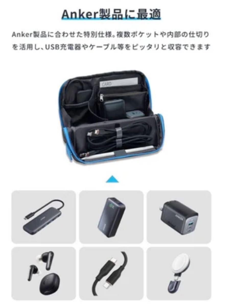 Anker製品に合わせた特別仕様。複数ポケットや内部の仕切りを活用し、USB充電器やケーブル等をピッタリと収容できます。