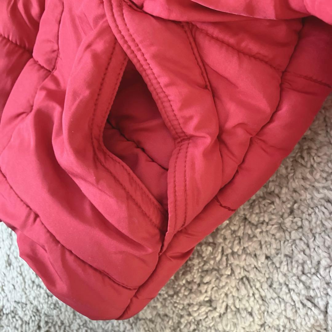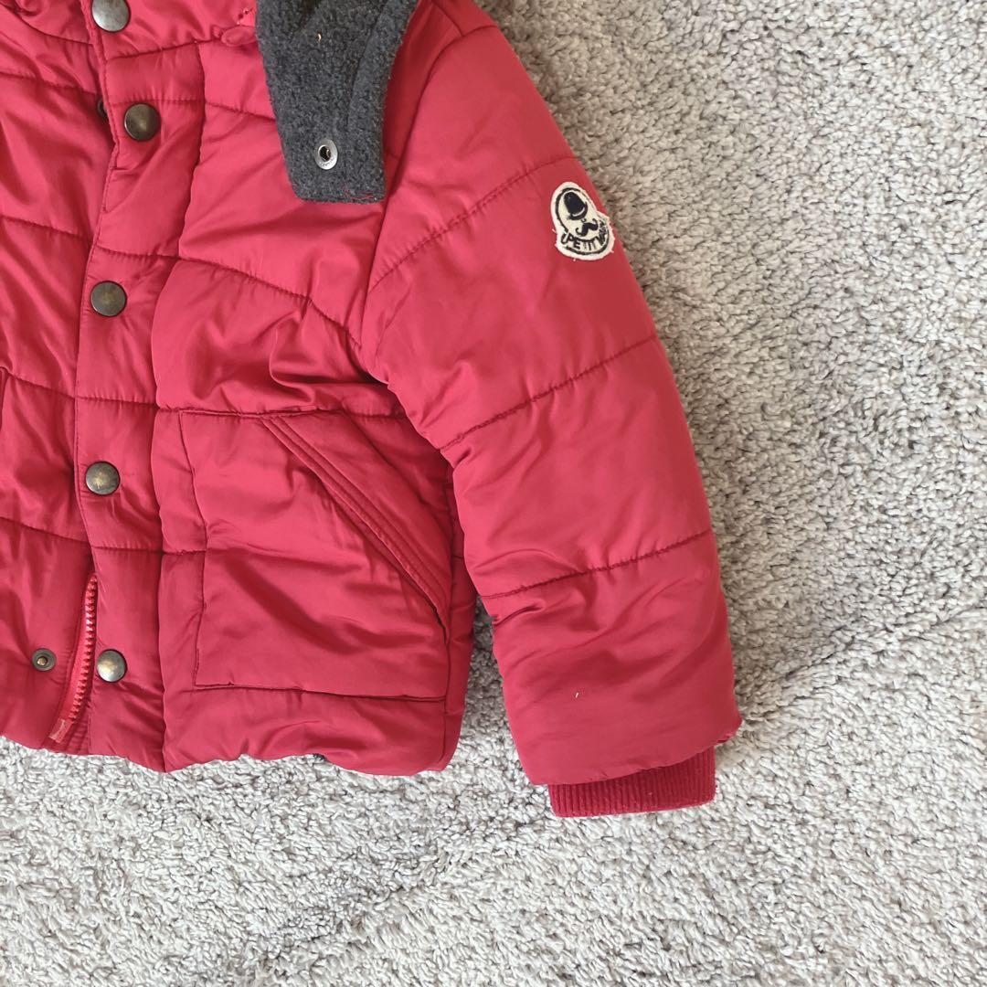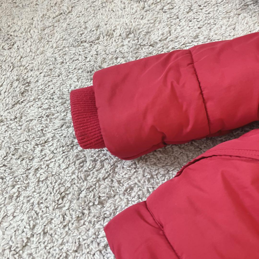 中綿コート、ボタン付きでグレーの襟が特徴。