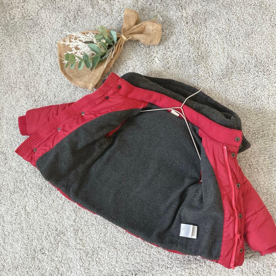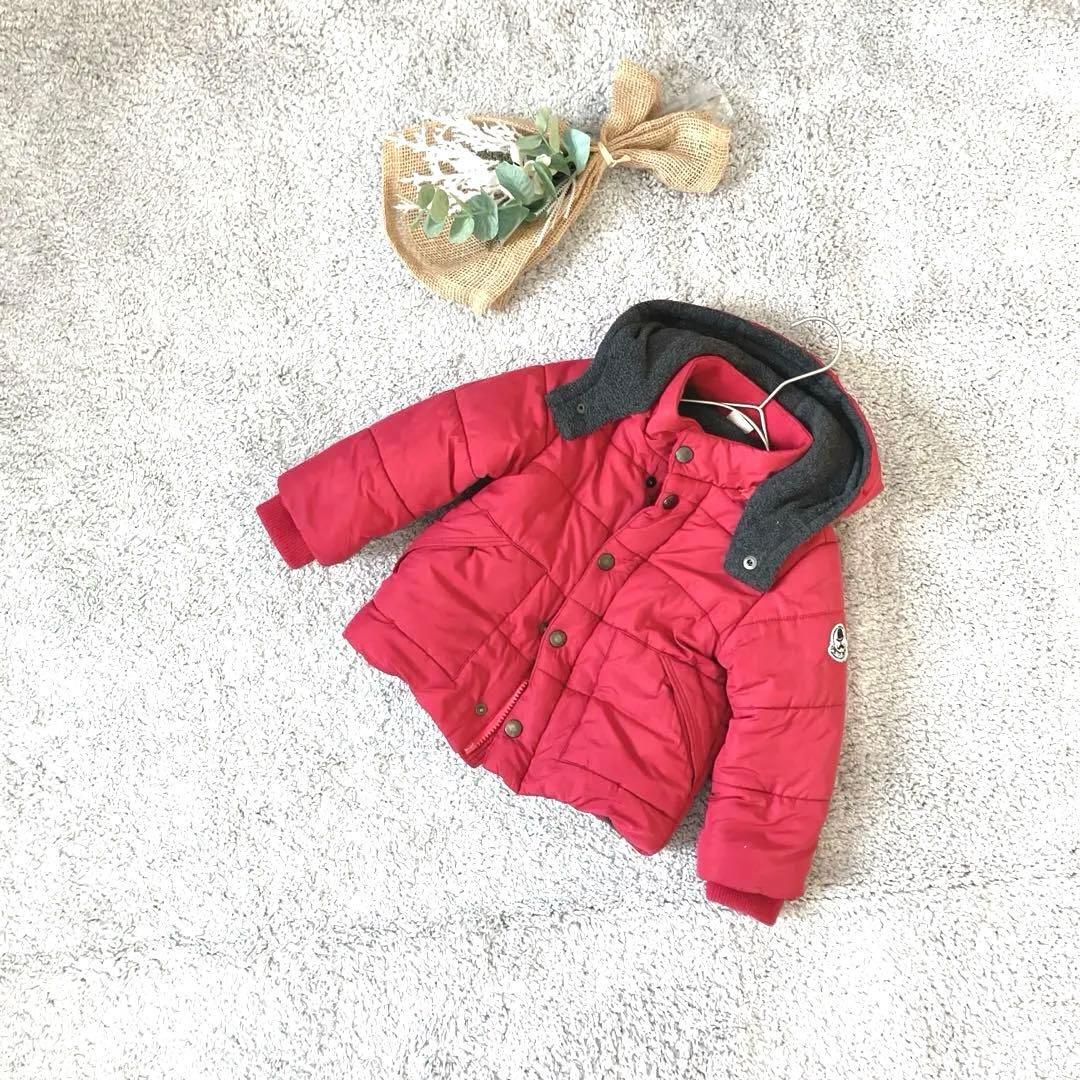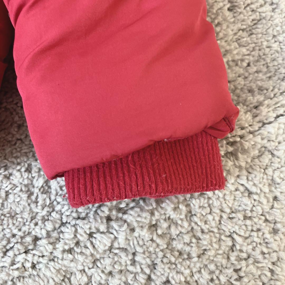 中綿コート、ボタン付きでグレーの襟が特徴。