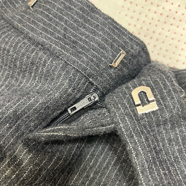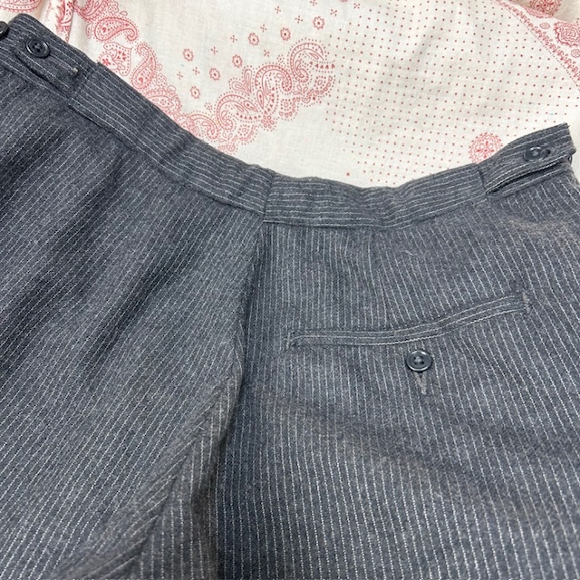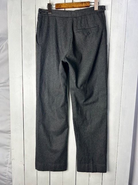●商品説明・・・ヨーロッパ古着になります。70年代~80年代頃までのオールド・ヴィンテージ物と思われるピンストライプ柄のウールスラックスパンツ(トラウザーパンツ)です。裾までストンとした感じのストレートシルエットで、両サイドにボタンタイプの調整できるようになっています(ベルトループの無いクラシック・トラッドな作り)。秋冬向けの厚手寄りの中厚手程度の一枚生地です。ジッパーはツメ式のOPTI(オプティ)です。。made in ENGLAND (イギリス製・英国製)で、表記などは無いですが、おそらくウール100%で、色はグレーです。サイズはウエスト実寸的にM程度のサイズ感かと思います。