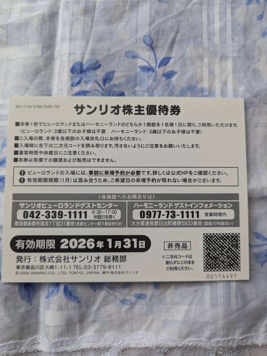 サンリオピューロランドまたはハーモニーランドの無料入場パスポート3枚セット