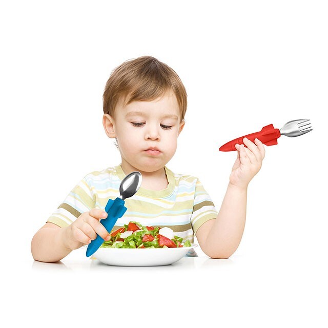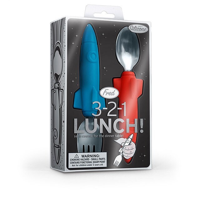 マンガの世界から飛び出してきたようなロケット型のスプーン&フォークセットです。