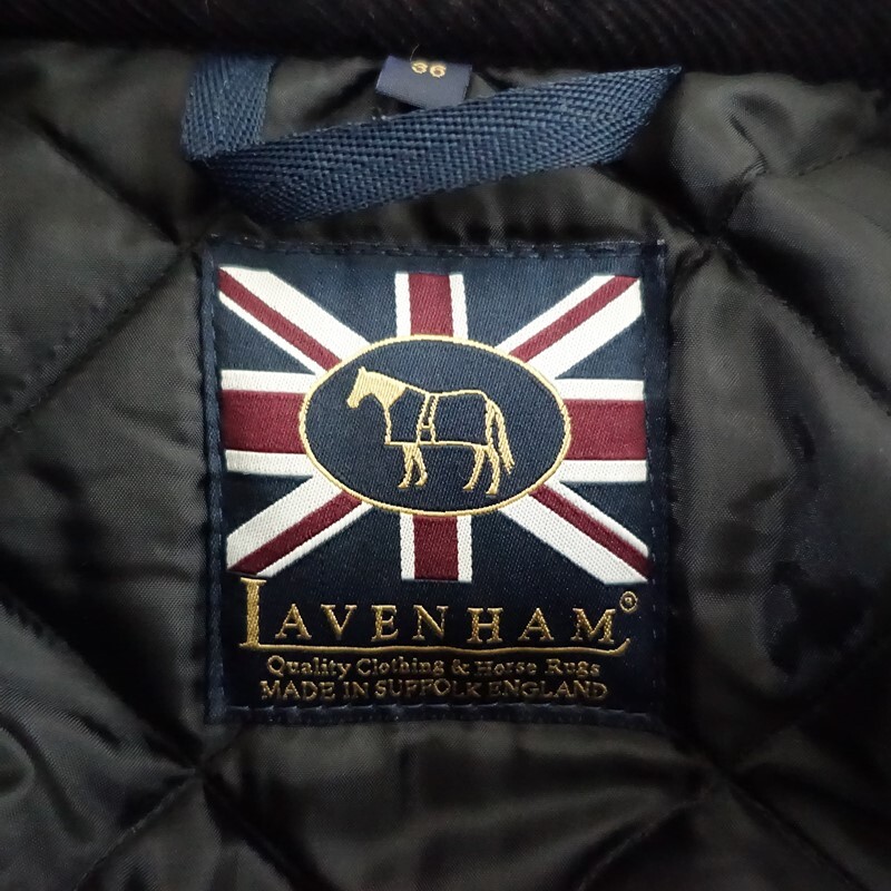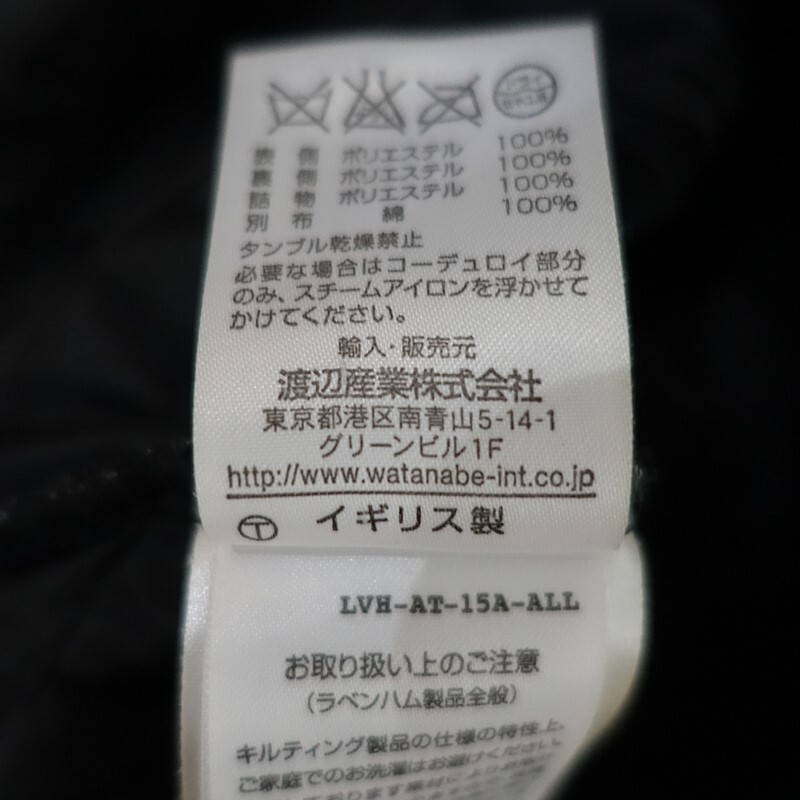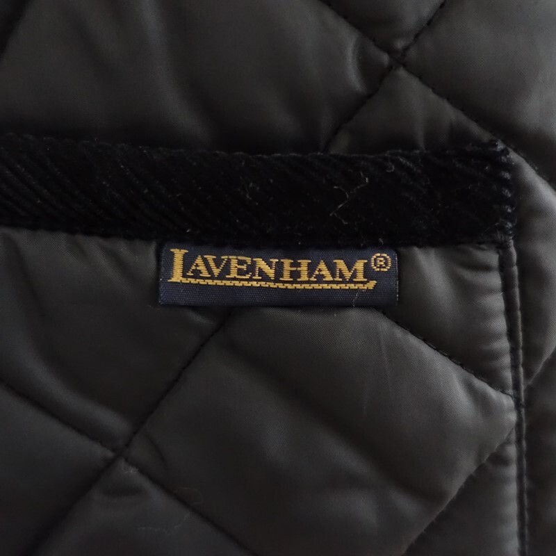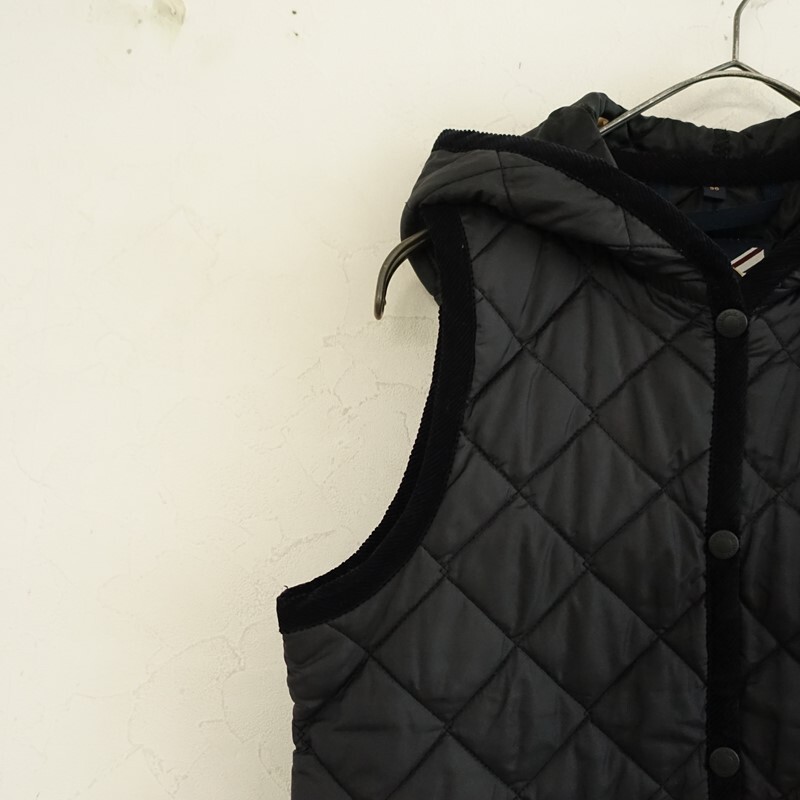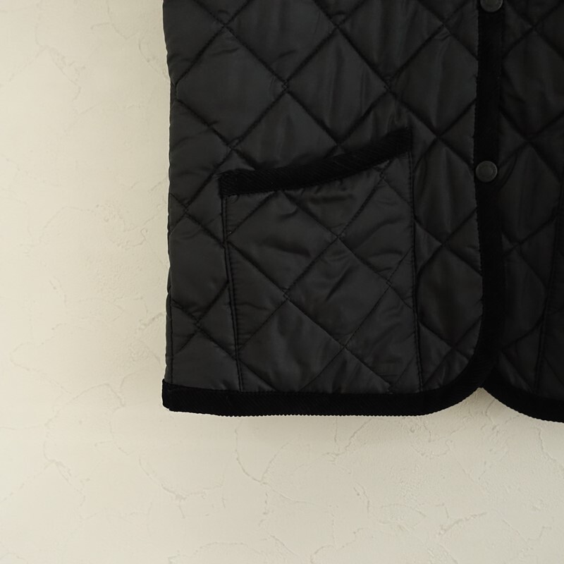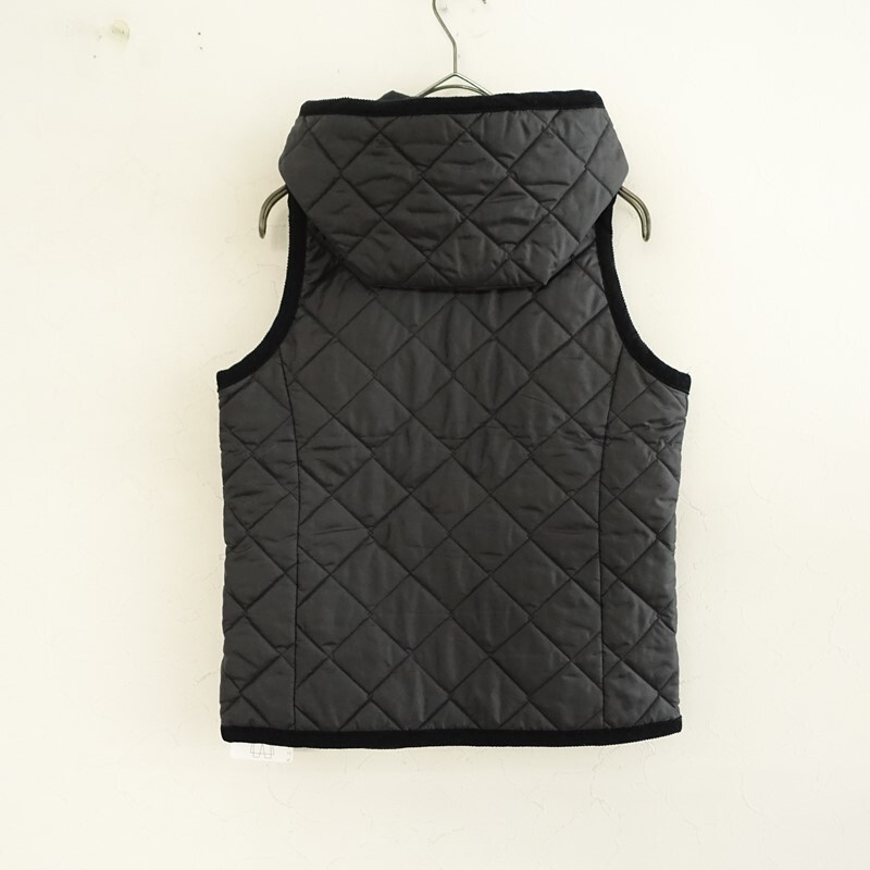 | LAVENHAMのフード付きキルティングベストです。カラーはブラックで、中綿入りのキルティング素材で仕立てられています。スナップボタン開閉で、コーデュロイ素材のパイピングがあしらわれ、両サイドにポケット付きです。 |