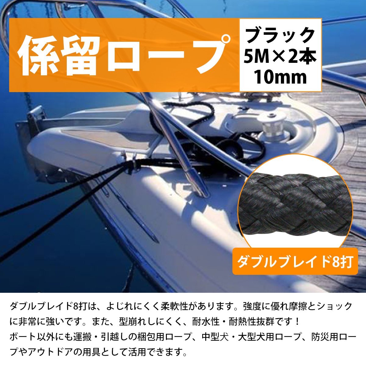 8打 10mm 5m 2本セット 計10m 係留ロープ フェンダーロープ ダブルブレイド 黒/ブラック マリン ロープ 船 係船 10ミリ