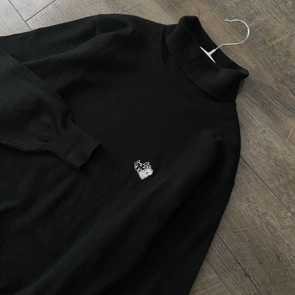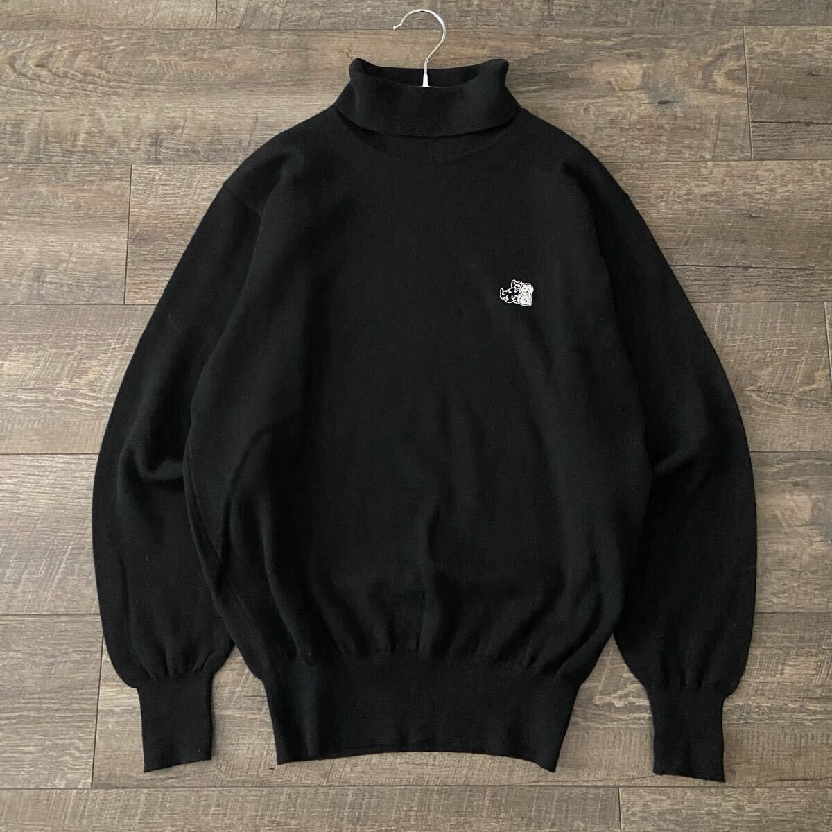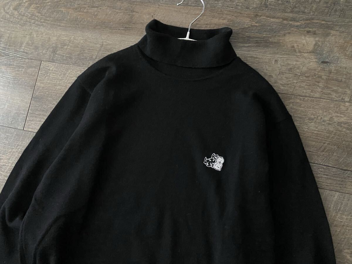 良品 BLACK&WHITE ブラック&ホワイト テリア刺繍 上質ウール100% タートルネック ニット シャツ M 黒 トップス セーター ゴルフ メンズ