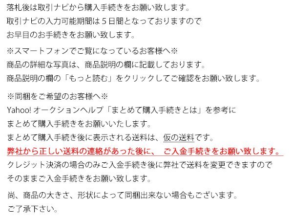 ★★ お取引の流れ ★★ ★商品落札★ オークション終了後、取引ナビにご入力をお願い致します。 ★お支払い方法★ 下記からお選び下さい。 ・クレジットカード決済 ・PayPay ・PayPayあと払い ・コンビニ(セブン-イレブン) ・コンビニ(ファミリーマート、ローソン、その他) ・ゆうちょ銀行 ・PayPay銀行 お振込み金額は 落札金額+消費税+送料 となります。 (振込み手数料と送料は落札者のご負担でお願いします。) ★商品発送、送料 ★ 入金確認後3営業日以内に発送いたします。 発送方法は原則として当社指定の佐川急便の元払いのみでの発送となります。 送料については出品時に説明の所で明記させていただいている料金でお願いいたします。 ★複数落札★ 複数落札は当初の落札日より5日間とさせていただき、出来る範囲で同梱発送させていただきます。 大きさや重量の関係で同梱発送が出来ない場合も御座いますのでご了承下さい。 同梱を希望される商品を「まとめて購入手続き」をしていただき、 弊社から送料の案内後、ご入金をお願い致します。 ★返品★ 商品の発送に関しましては細心の注意を払って管理しております。 しかし、もし万一お届け商品が下記の項目に該当する場合、 お手数ですが商品到着後3日以内にご連絡ください。 誠意を持って、早急に対処させていただきます。 1.お届けの品が、ご注文の品と違った場合。 2.お届けの品について、実測寸法などが商品説明と著しく違う場合。 3.運送途中で破損した場合。 古い商品の為、説明不足の場合もあると思います。 説明不足はクレームの対象になりませんのでご注意下さいませ。 気になる点がありましたら質問欄にてご質問をお願い致します。 営業時間外のご質問はお返事が遅れる場合もございます。ご了承下さいませ。 ★キャンセル★ 落札後のキャンセルにつきましては、原則、一切お受けできません。 ご入札の際は十分に画像等を、 ご確認していただいてから慎重なご入札をお願い致します。 取引ナビの入力・メールの返信が5日以上ない場合、またはどうしてもキャンセルされる場合は [非常に悪い]の評価をつけさせていただき、キャンセルとなります。ご了承ください。 ※注意※ 落札後のキャンセルや終了間際の取り消しなどは 税込落札金額の2割の罰金をご請求させていただきますので、ご注意下さい! |