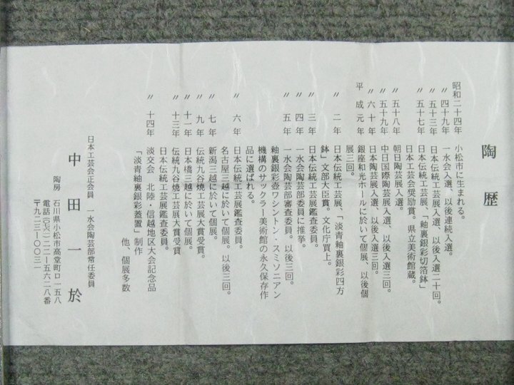 【中田一於】 本名は和雄、1949(昭和24)年3月15日、小松市生まれ。 寺井高卒業後、家業の中田錦苑窯に従事し、陶芸技術を習得。 三代徳田八十吉氏に指導を受けた。 日本伝統工芸展には78年に初出品して初入選し、82年に日本工芸会奨励賞、 90年に文部大臣賞、2010年に日本工芸会保持者賞を受けた。 同年に北國文化賞、11年に紫綬褒章、12年に小松市文化賞、 19年に旭日小綬章。日本工芸会監事、 一般財団法人石川県美術文化協会理事、小松美術作家協会長。 ★商品サイズ★ 高さ5cm 口径5.7cm ★商品の状態★ 経年に伴う汚れや釜キズはご承知の上、 時代など詳しくは画像にてよく確認のうえでご検討いただければと思います。 どうぞよろしくお願いいたします。 |