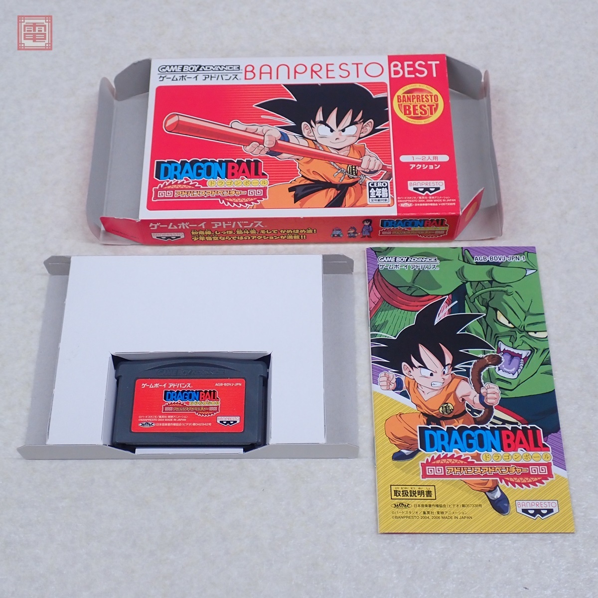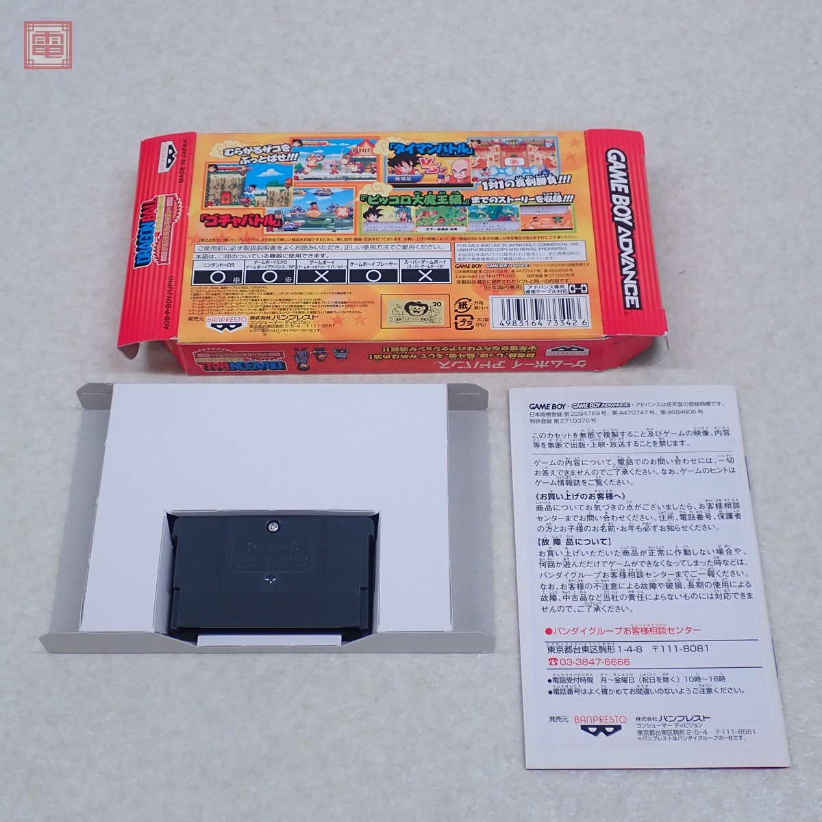 動作保証品 GBA ゲームボーイアドバンス ドラゴンボール アドバンスアドベンチャー DRAGONBALL BANPRESTO BEST バンプレスト 箱説付 こちらの商品は動作保証品となりますので、一週間の動作保証をお付けします。 ■箱にスレ、汚れ、キズがあります。 ■取扱説明書にスレ、角スレ、汚れ、イタミがあります。 ■カセットにスレ、キズがあります。 ■上記以外は未チェックです。 ■写真のものが全てです。付属物の有無や状態については写真からご判断ください。 ■付属物については細かいチェックはしておりませんので、万が一、欠品があったり余計な物が入っていたとしてもご了承ください。 ■商品到着後、当店の保証期間中は、商品及び箱や取説、付属品などを1つでも廃棄や破損をしないようにお願い致します。廃棄や破損をした場合、商品に問題があった場合でも対応や返金などの対処ができなくなります。 ■商品によりますが、発売されてから10年以上経過している中古品である事をご理解頂いた上でご入札をお願い致します。なお、新品や美品、また特記事項がある場合は別途明記します。 | |||