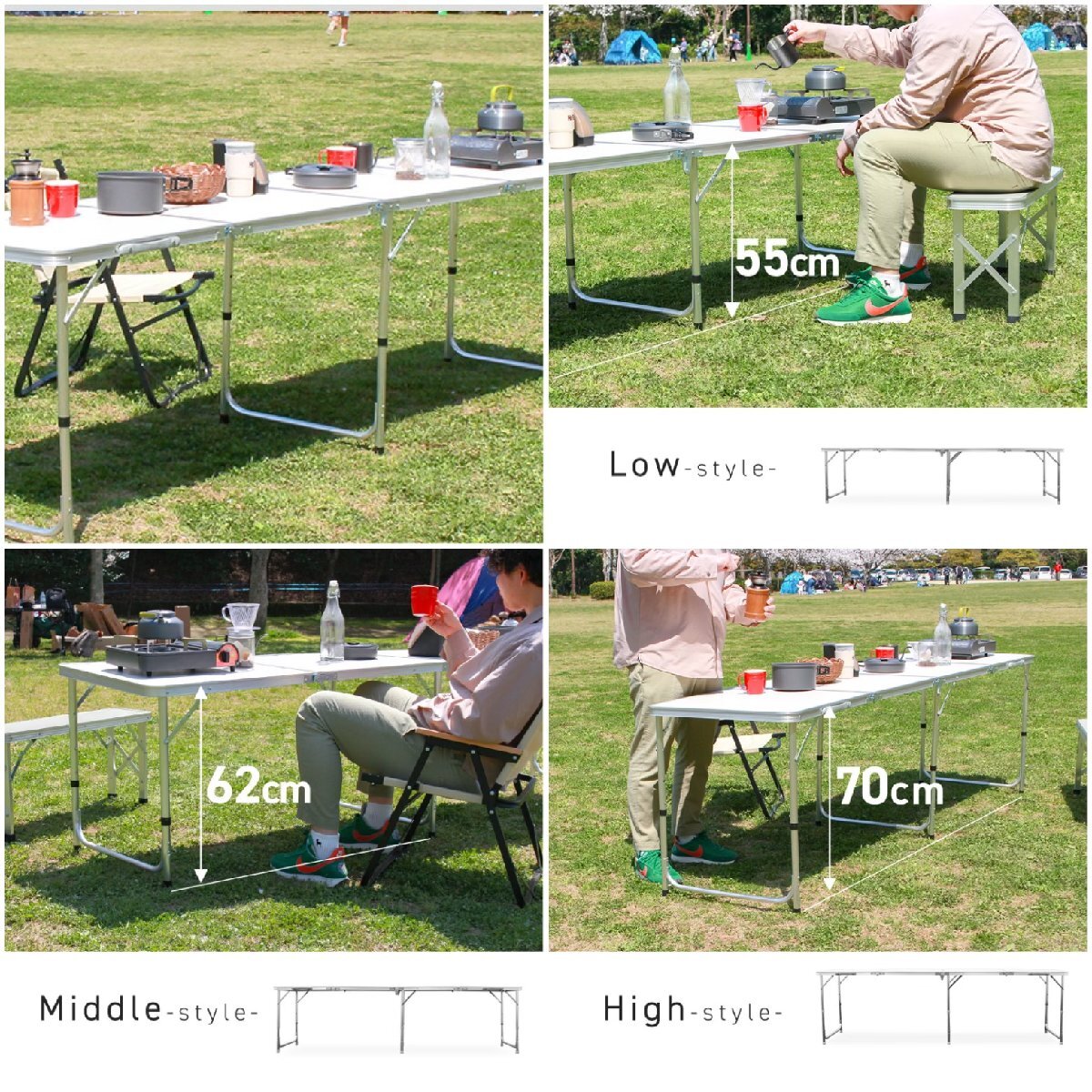 テーブル面サイズ(約): 240×60cm 耐荷重(約): 30kg 高さ(約): 55cm/62cm/70cm (3段階調整) 収納時サイズ(約): 60×60×13cm (4つ折り収納) |