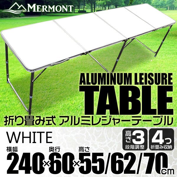 アルミ製 折りたたみ式 アルミレジャーテーブル 横幅240×奥行60 4つ折り収納 高さ3段階調整 55/62/70cm カラー一覧 | |