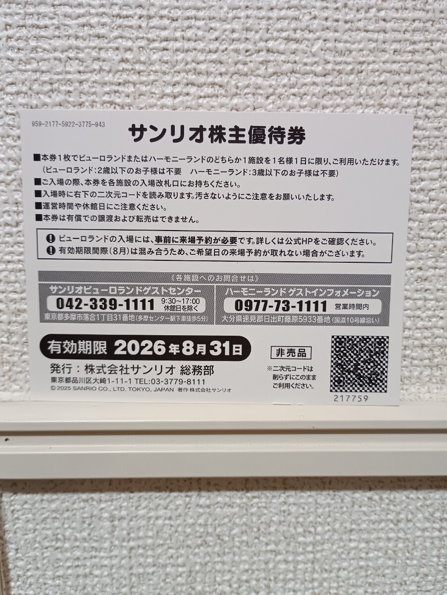 最新 株主優待券ピューロランド・ハーモニーランド入場券1枚 +サンリオショップ1000円割引券1枚 ※サンリオピューロランド の入場には来場予約が必要です。公式HPをご確認下さい。有効期限:2026年8月31日