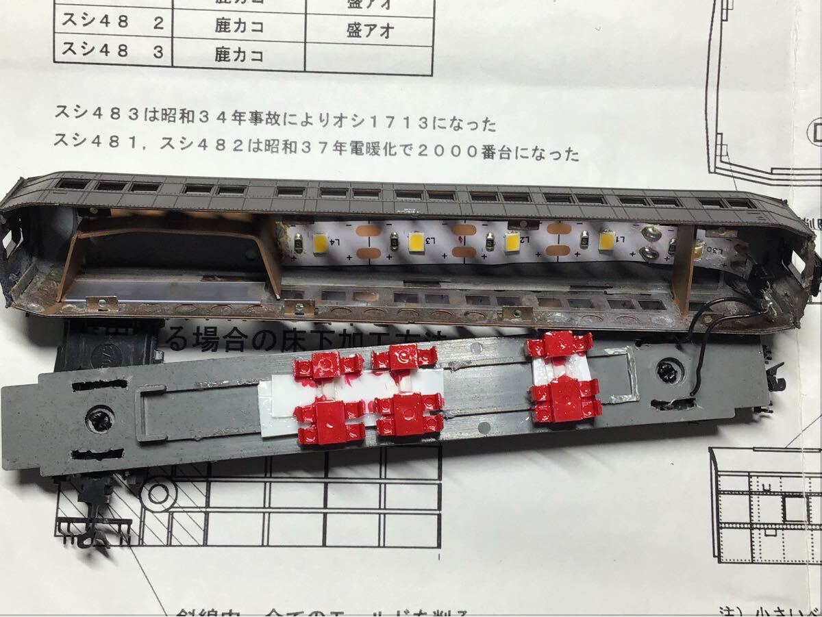 室内灯は自作のLEDテープで台車からの直接集電で、台車はKATOの TR73
