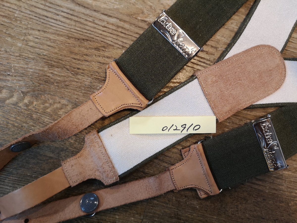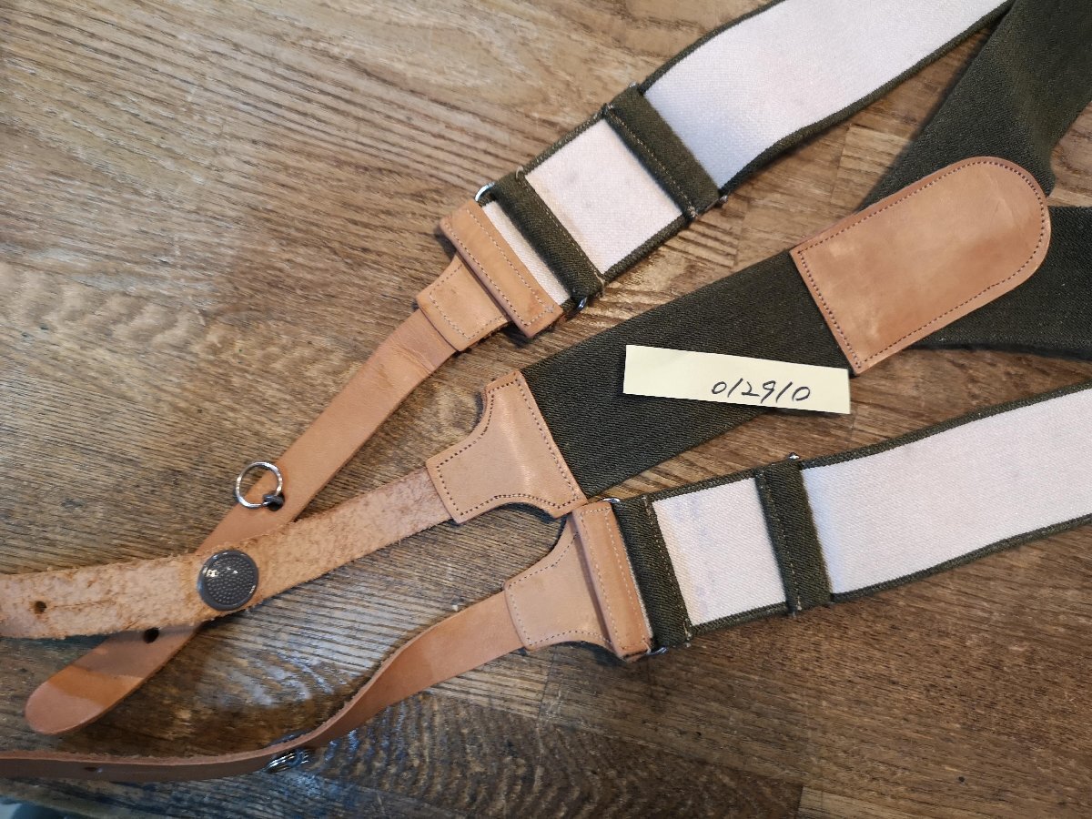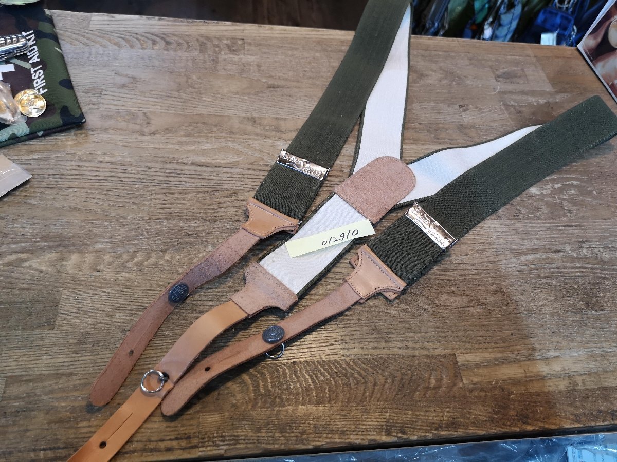 1枚目の写真は流用です。 東ドイツNVA放出のレザーコンビのサスペンダー、パンツ側のDリングやベルトループで固定する便利なタイプです。ベルト幅は4.5センチ程度、ラバーサスペンダーですので伸びますが最長サイズは静止状態でボタンホールの間が100センチ程度、伸ばせば120センチ前後程度で基本的に男性用サイズです。 クロネコネコポス便200円でお送りいたします、落札価格にプラスでお願いいたします。服飾小物 。