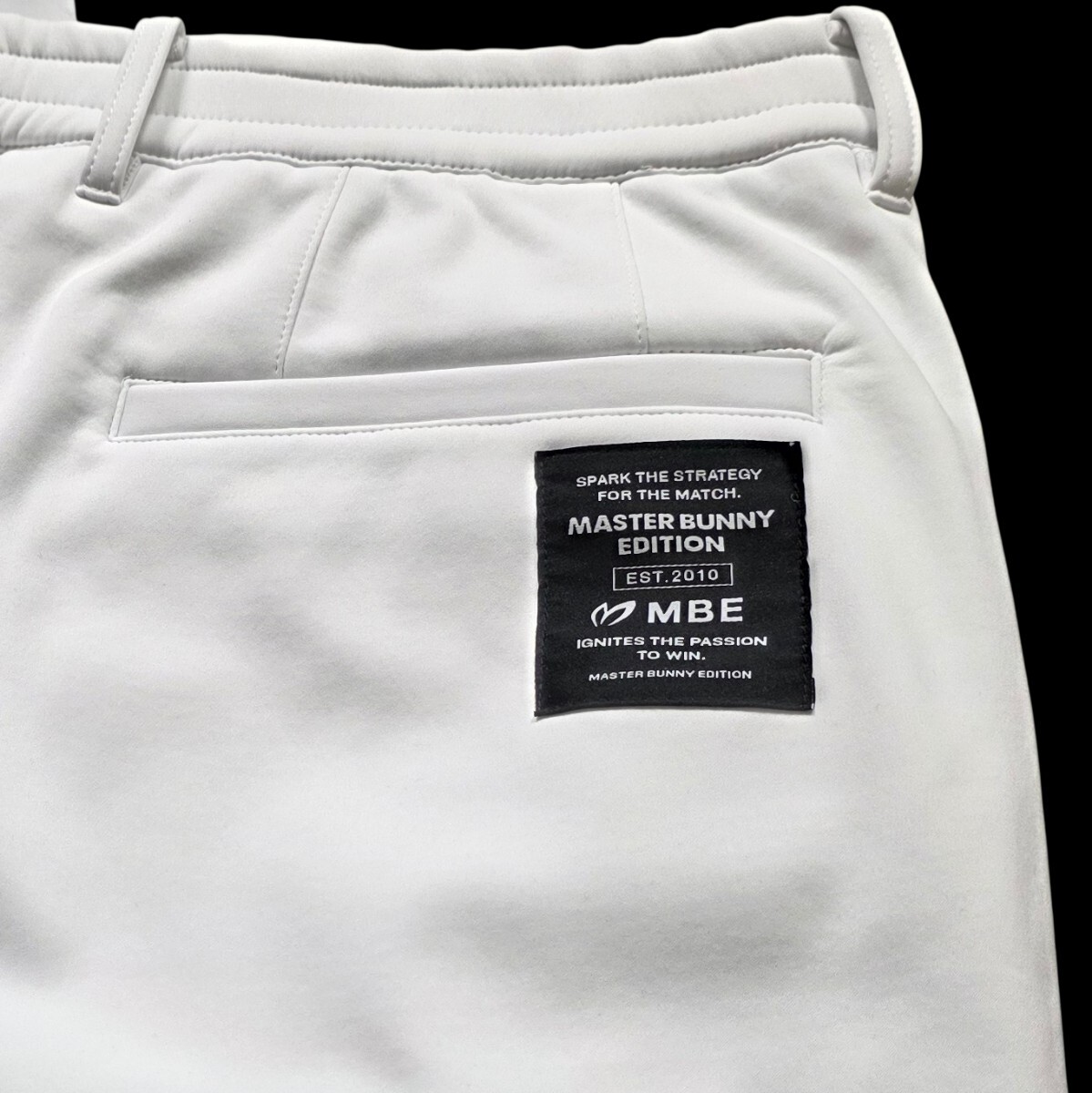 MBEのアートロゴが芸術的なインパクトを着こなしに与えてくれる、撥水ストレッチボンディングパンツ。