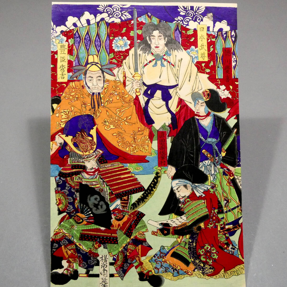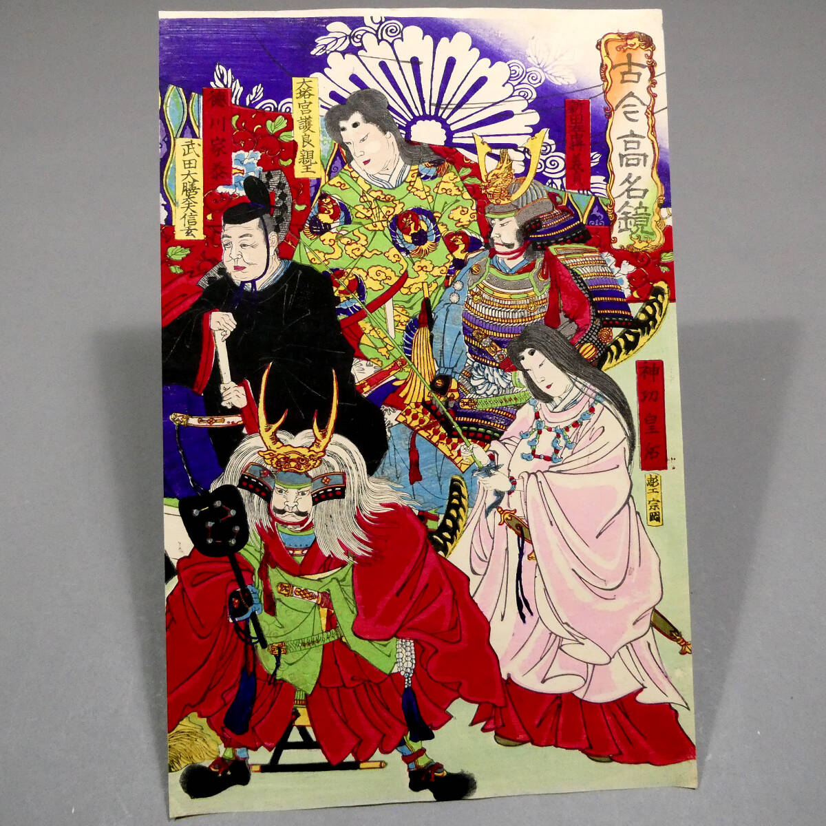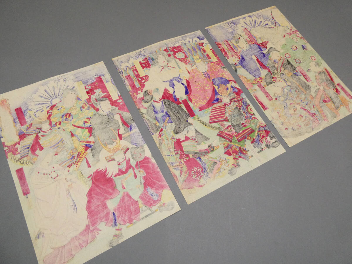 ■ 楊洲周延 明治16年 木版浮世絵 「古今高名鏡」3枚続揃い 神話時代~維新の元勲 ヤマトタケル 武田信玄 ■