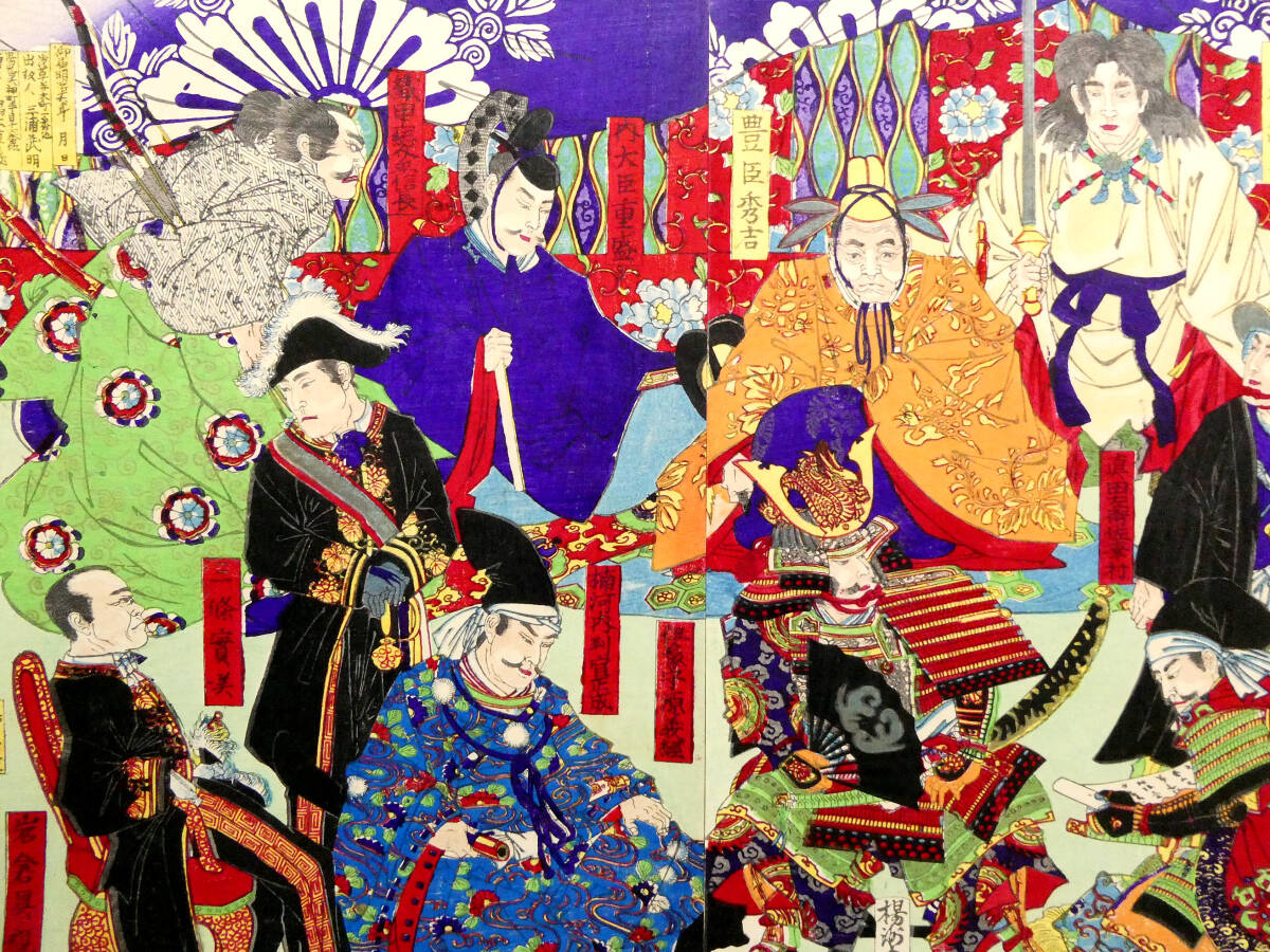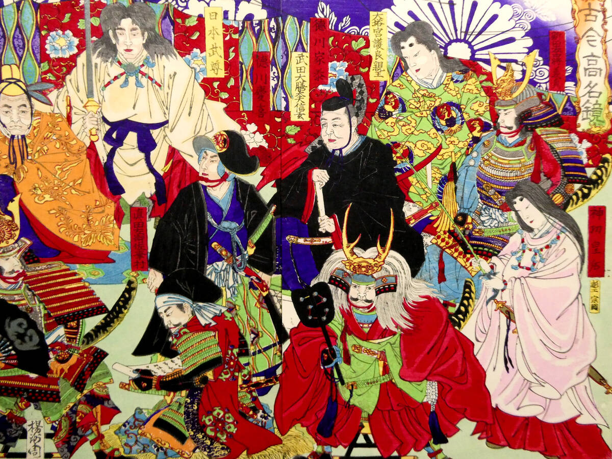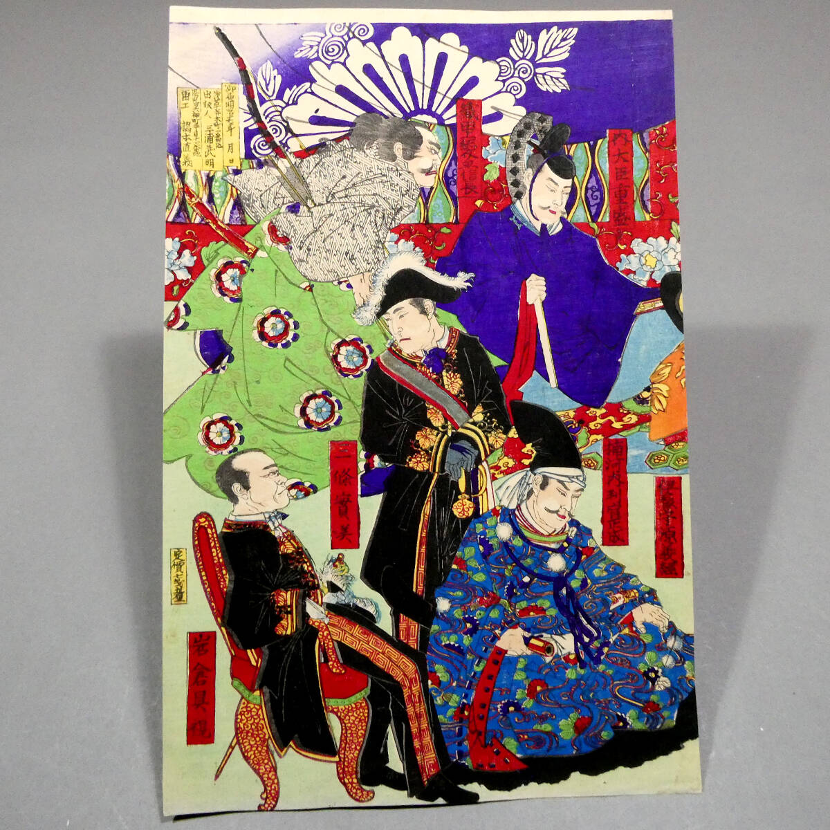 ■ 楊洲周延 明治16年 木版浮世絵 「古今高名鏡」3枚続揃い 神話時代~維新の元勲 ヤマトタケル 武田信玄 ■