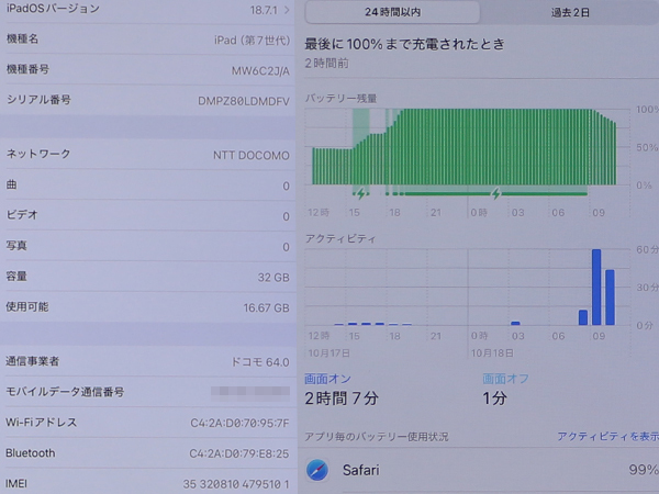 | ◆ 第7世代 iPad 32GB auモデル MW6C2J/A(SIMロック解除済み)です。 ◆ 内蔵電池はフル充電後、明るさ50%、音量50%で2時間7分のYoutube再生後、残量は82%でした。 ◆ 液晶はほぼ無傷です。外装には所々に小傷がございます。 ◆ 下記の動作を確認しています。 ※SIM通信機能はOCNモバイルを利用しています。