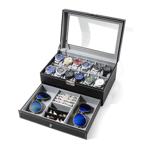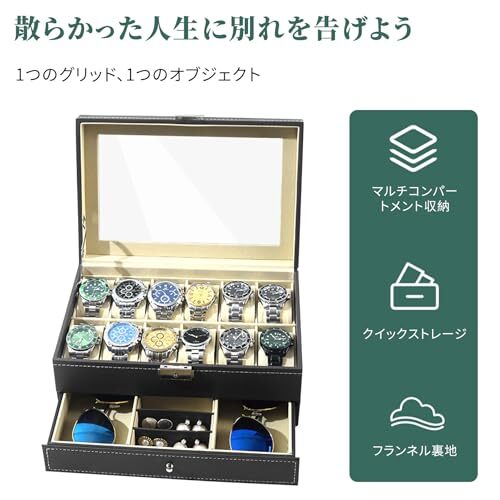 【素早く整理】上部の収納スペースには12個のスロットがあり、下部の引き出しには複数の収納スペースがあり、ネックレス、指輪、ボタンホール、サングラスなどを収納できます。2つのセクションに分かれたウォッチケースなので、必要なアクセサリーを素早く見つけることができ、忙しい朝の時間を節約できます。