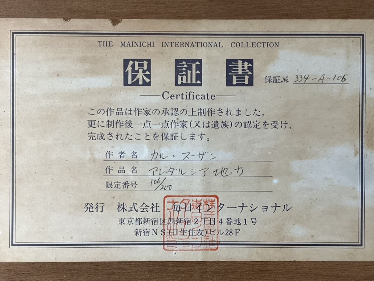 可能な限り現物に近い色合いを出せるように撮影をさせて頂いていますが、人それぞれの感じ方や色彩感覚、撮影環境、カメラ、モニター等環境の違いよる差異は御了承下さい。 保管箱や黄袋の有無は表中、ご説明欄に記載致しております。 尚、額縁や箱等はあくまで商品ではなく附帯品とお考え下さい。額は新品ではありません。販売させて頂いていますのは額縁ではなく作品そのものです。 額、箱等に対する落札後のクレームは一切御遠慮ください。額縁や箱等附帯品重視の方は御遠慮頂いた方が宜しいかと思います。 あまりに仕入れ値とかけ離れている場合は出品を取り消す事がございます。御理解下さいませ。
