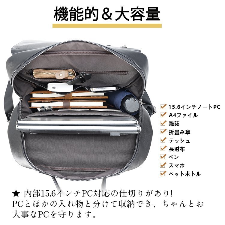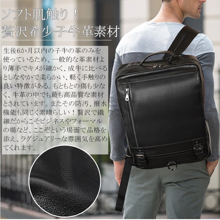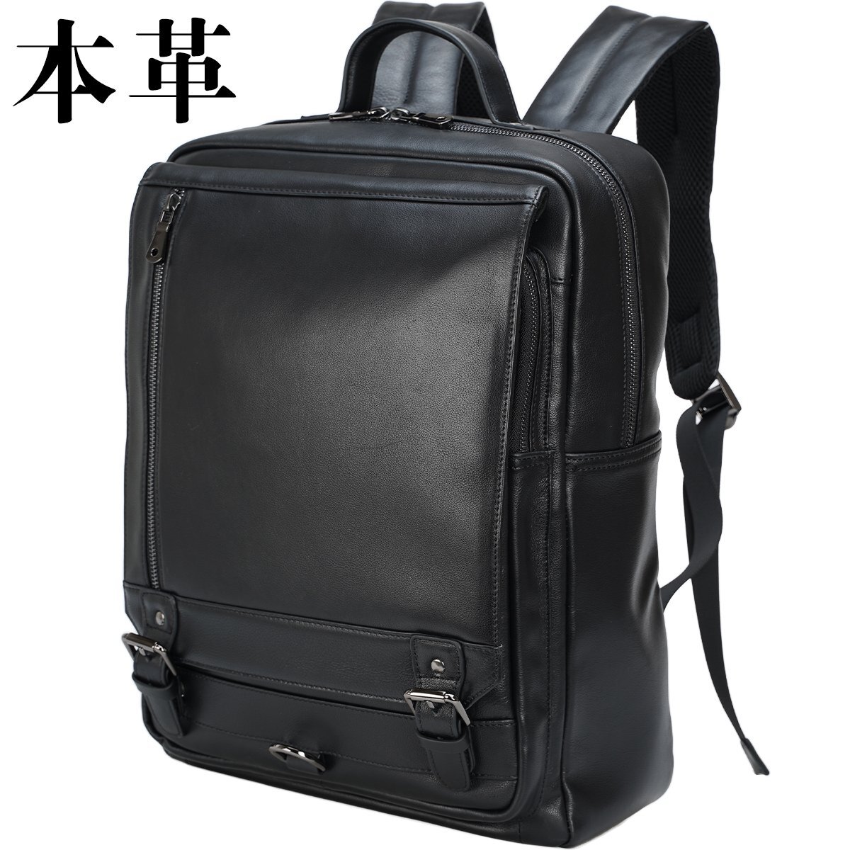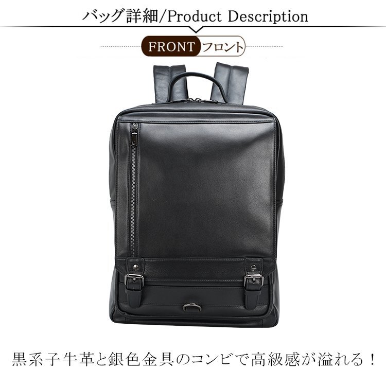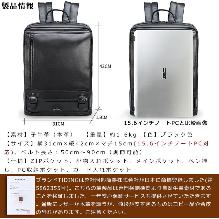 TIDING 洗練感 子牛革 リュックサック 自転車リュック 通勤鞄 ビジネスリュック 15.6PC対応 本革バッグ カーフレザー 黒