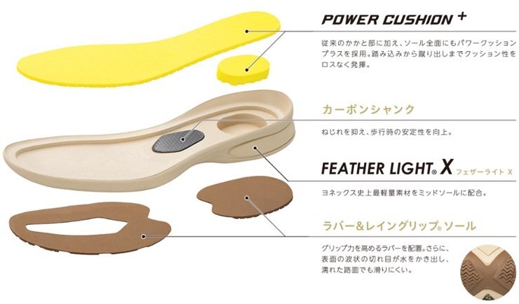 | 12mの高さから生卵を落としても割れずに6m以上跳ね返す 「パワークッションョンプラス」搭載 。 疲れにくい!!ヨネックスのパワークッション、ウォーキングシューズです。 かかとから指先まで全面フォロー! パワークッションプラスで快適ウォーク 濡れた路面も滑りにくい レイングリップソール ■撥水ストレッチPUレザー 伸縮性が高く、ソフトな履き心地ながらもフィット感はしっかりとした人工皮革。 様々な甲の高さや足幅にも柔軟に適応します。 ■ベリークール 裏面のパワークッションは格子状に成型。表面は水分と接する熱を吸収する「キシリトール」でムレを軽減。 ウェーブが足の滑りを防止し、快適な履き心地。 ■レイングリップソール 波状の切れ目が地面を捉え、濡れた路面のグリップ性が向上し、滑りにくくなりました。 | |