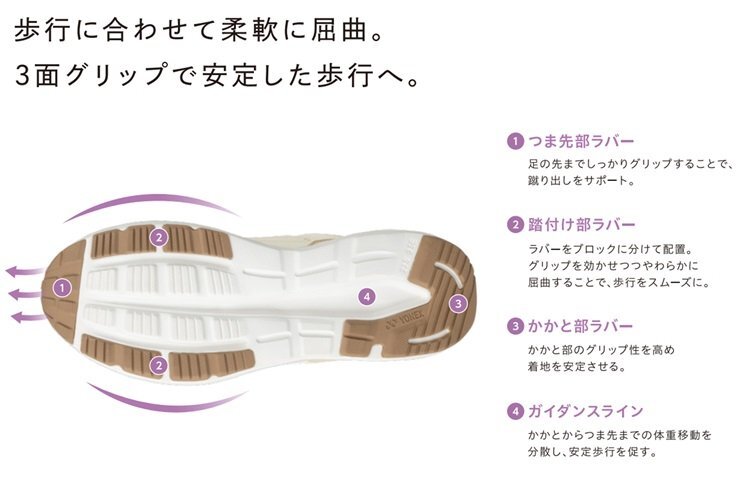 | 素材 | [アッパー]撥水合成繊維、撥水人工皮革 [インソール]パワークッション [ミッドソール]パワークッションプラス、 合成樹脂、特殊樹脂シャンク [アウトソール]ラバー |