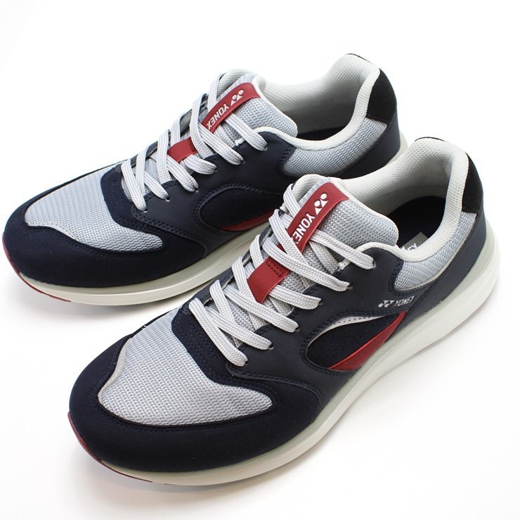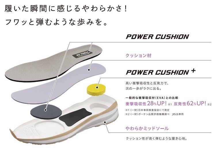 | 7mの高さから生卵を落としても割れずに4m以上跳ね返す 「パワークッション」搭載 。疲れにくい!!ヨネックスのパワークッション、ウォーキングシューズです。 履いた瞬間に感じるやわらかさ! ふわっと弾むような歩みを実現するカジュアルスニーカーモデル。 撥水加工アッパー。 ワイズ:3.5Eタイプ | |