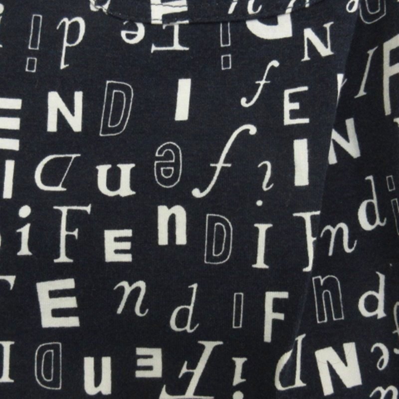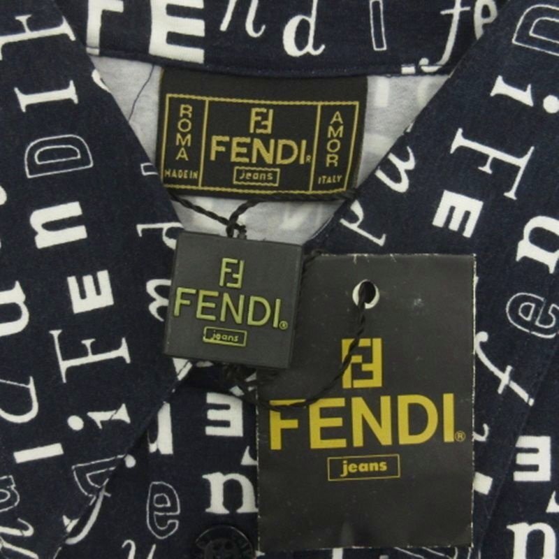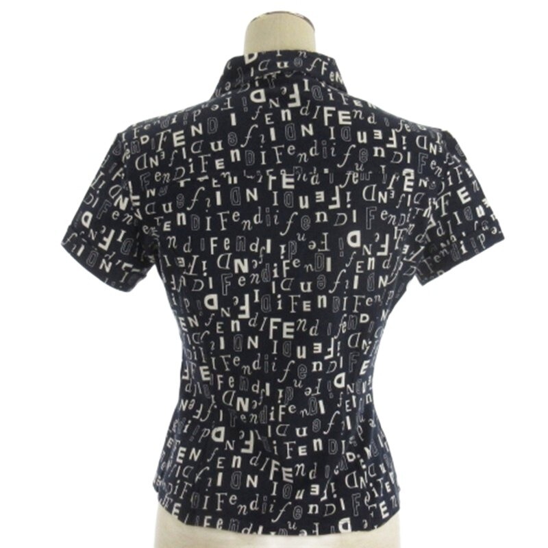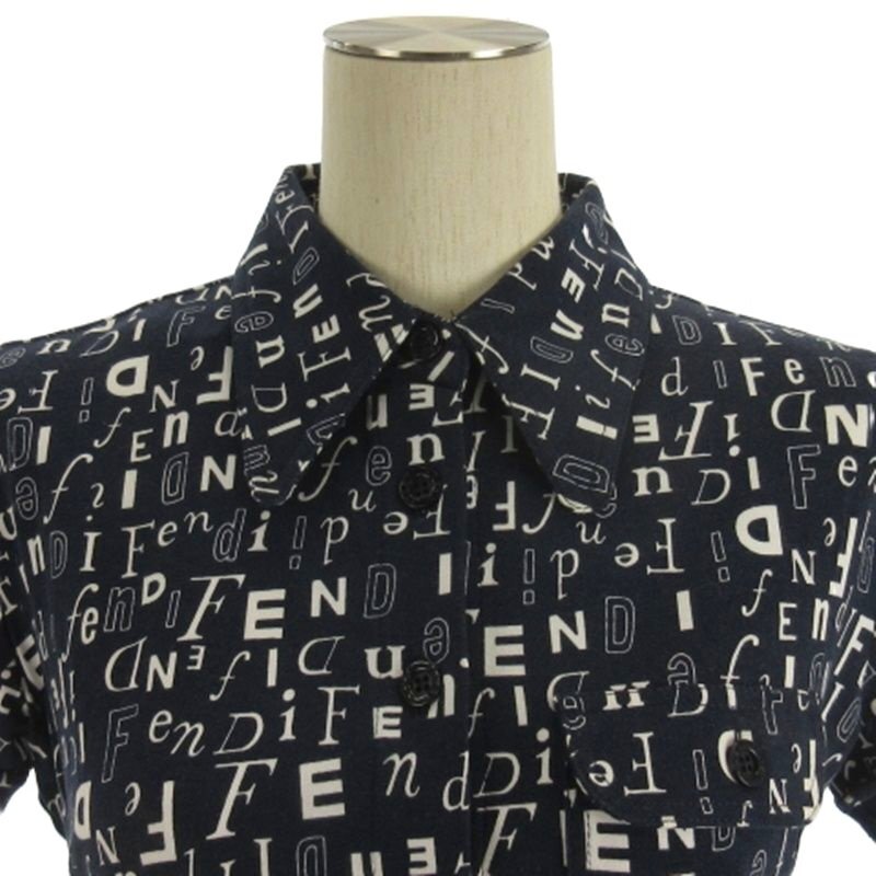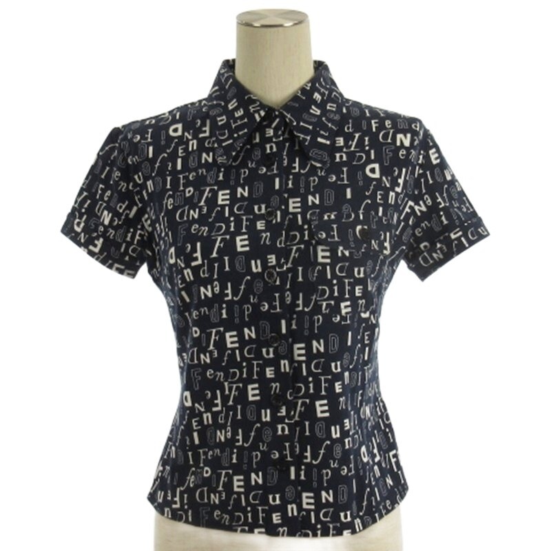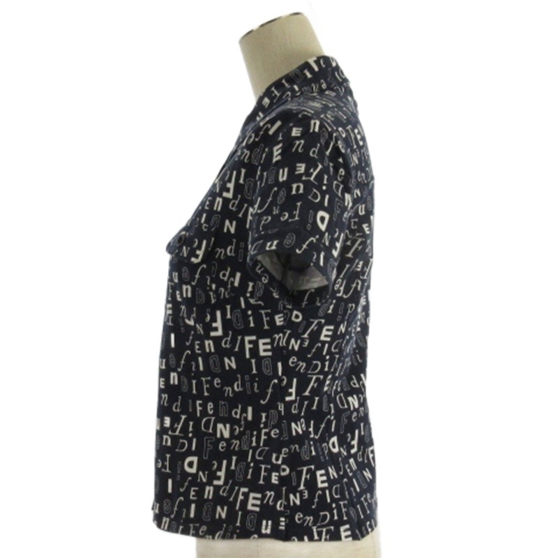 フェンディ FENDI ロゴ シャツ 半袖 総柄 ネイビー 40 ☆AA★ レディース