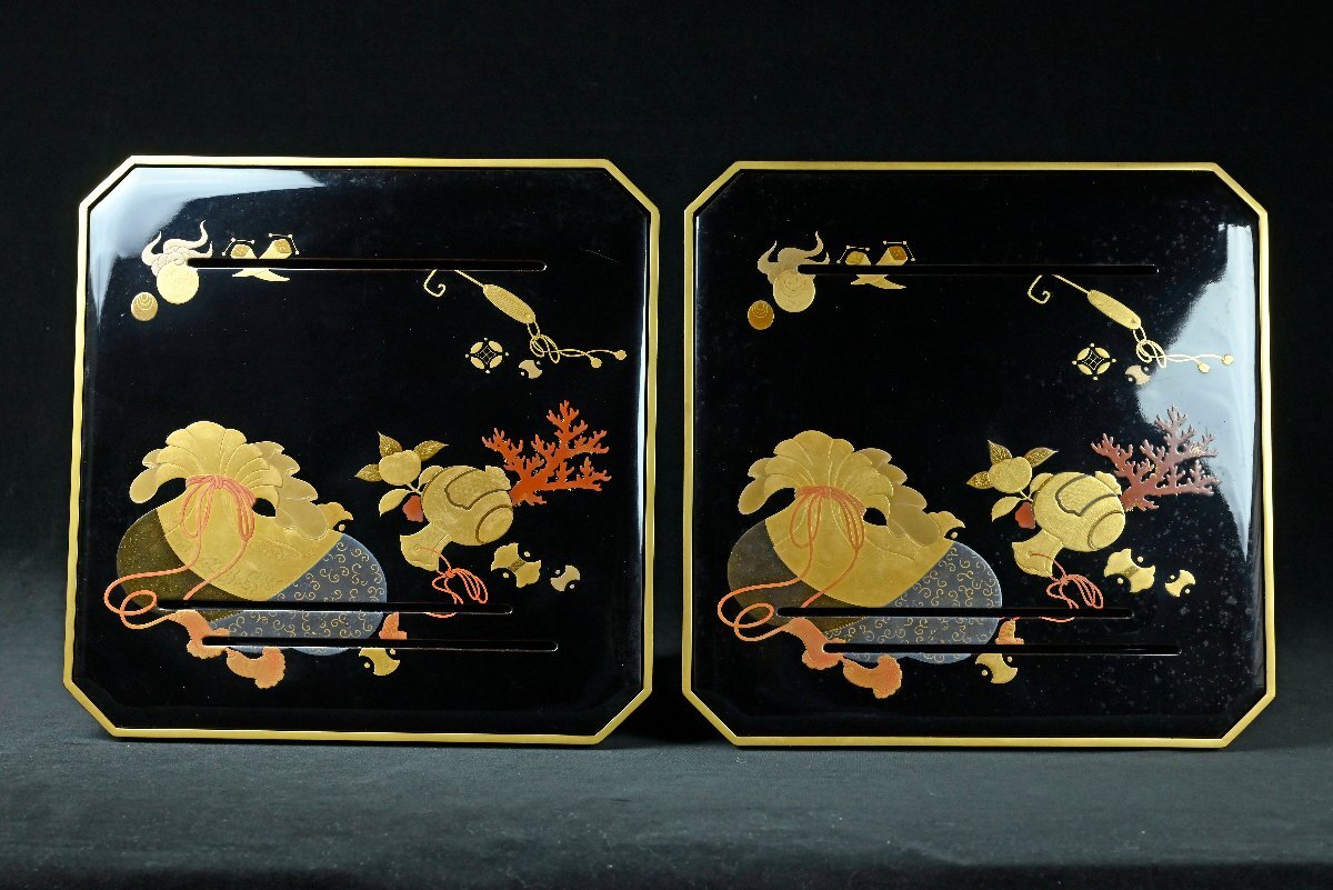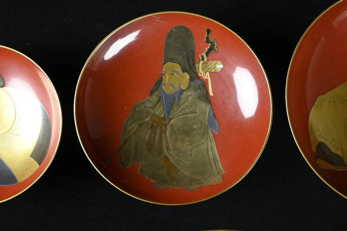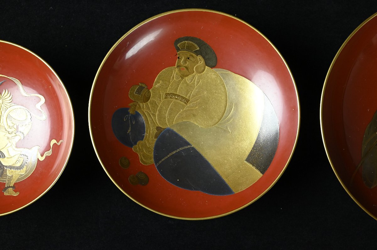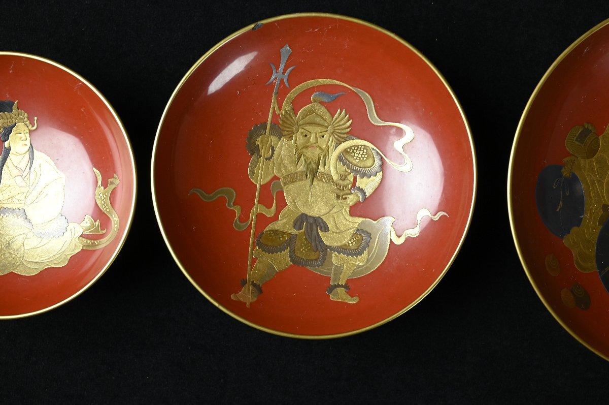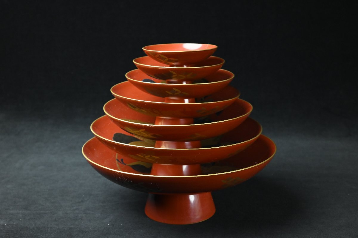 【昊】大名家伝来品時代名品 超絶技巧 宝尽くし蒔絵盃台 細密細工 七福神金蒔絵朱塗蒔絵盃(七つ組杯)箱蓋裏在銘[TK52y]