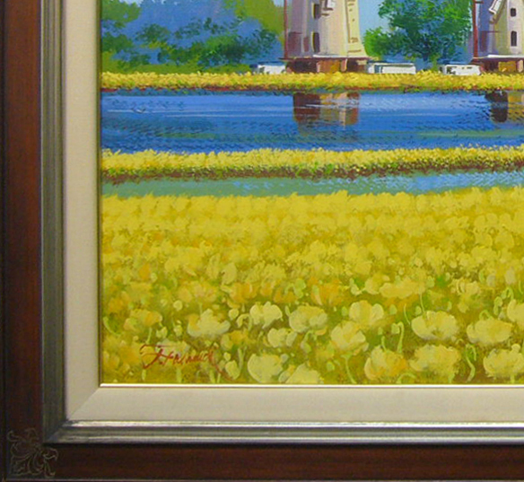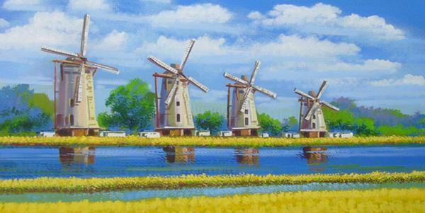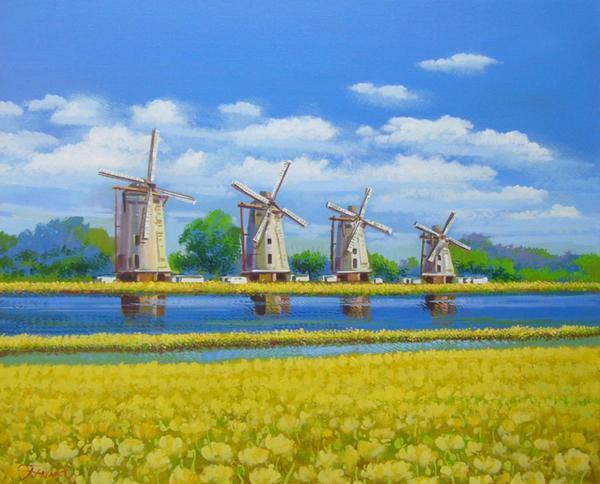 | 作品説明 | 壮大で何処までも続く青い空の下、一面に黄色の花が咲き誇っています。運河沿いには、幾つもの水車が立ち並び、ゆったりと回転しています。風が花の香りを運んできます。のんびりとした空間が其処には有ります。♪アートフジ♪ |