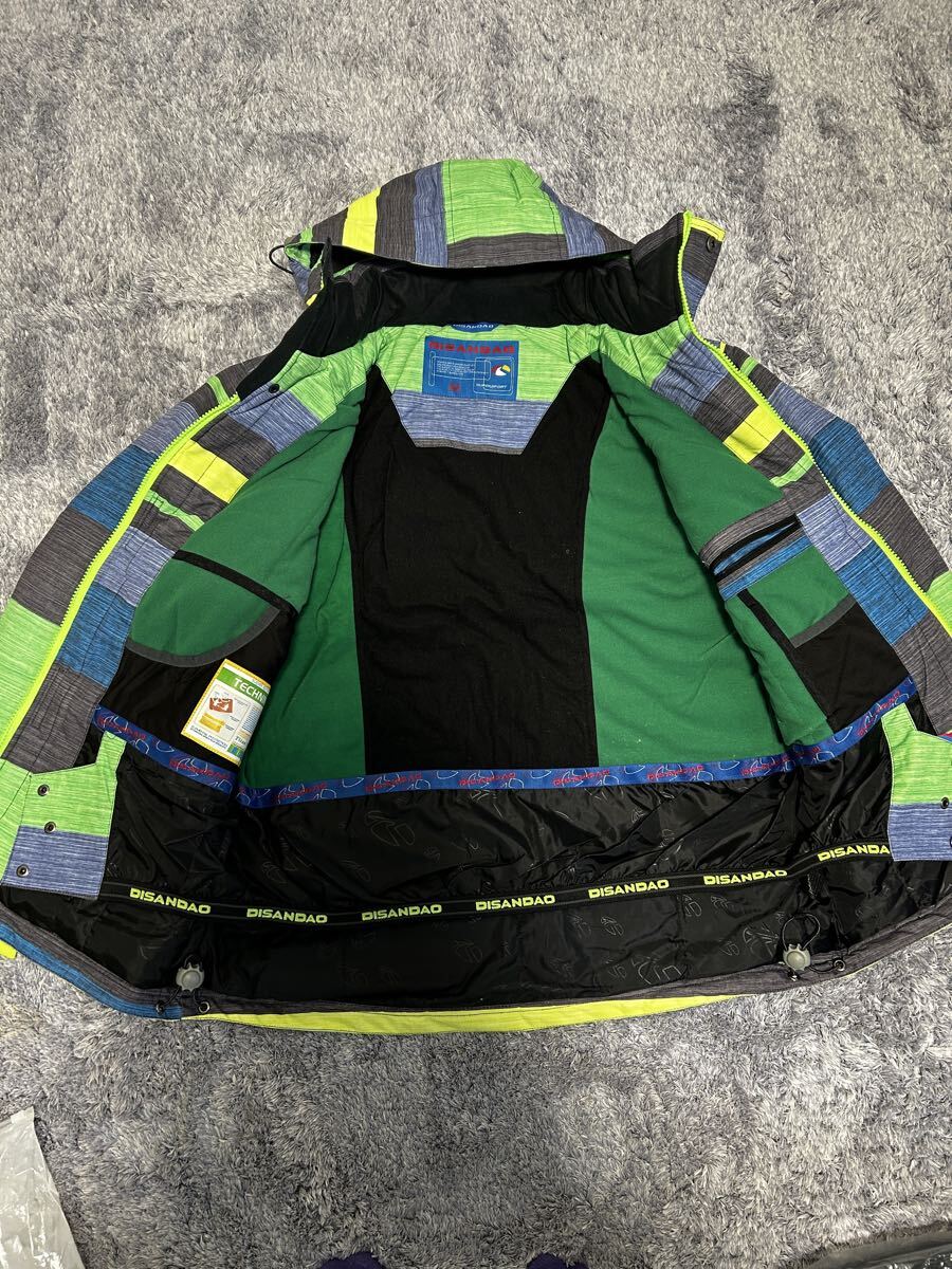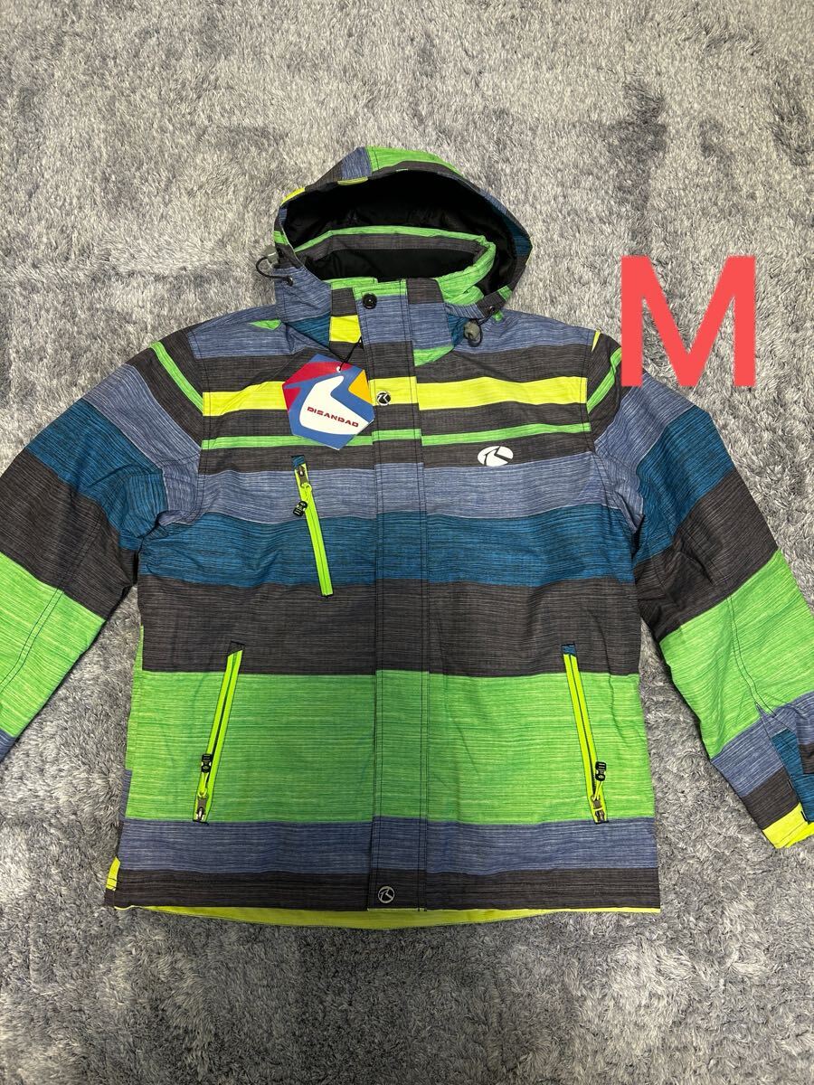 マルチカラーのストライプデザイン、取り外し可能なフード付きのスノーボードウェア。