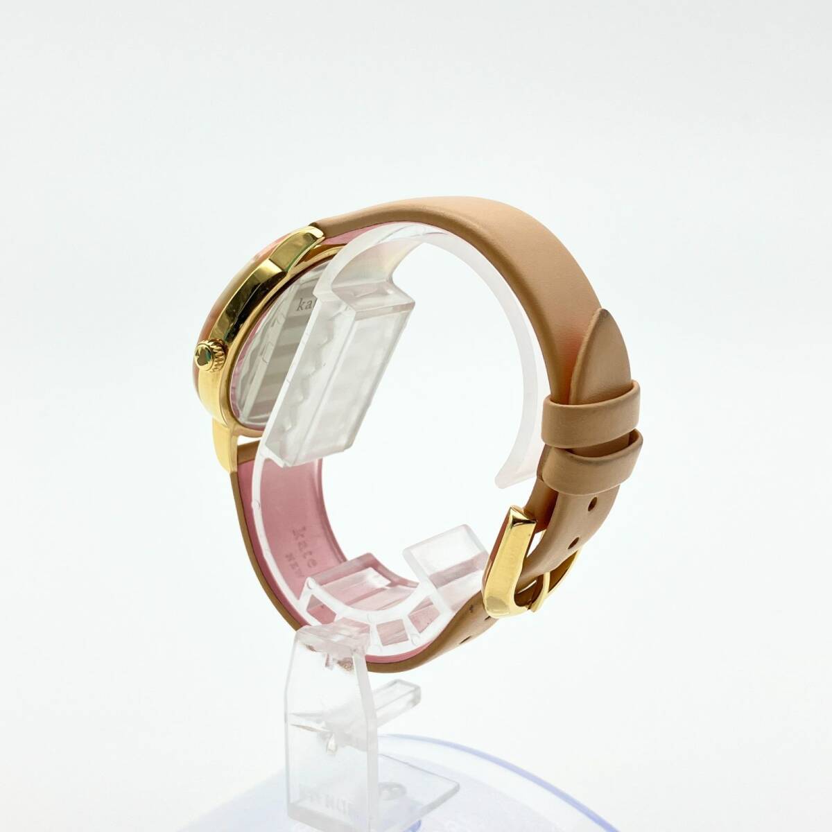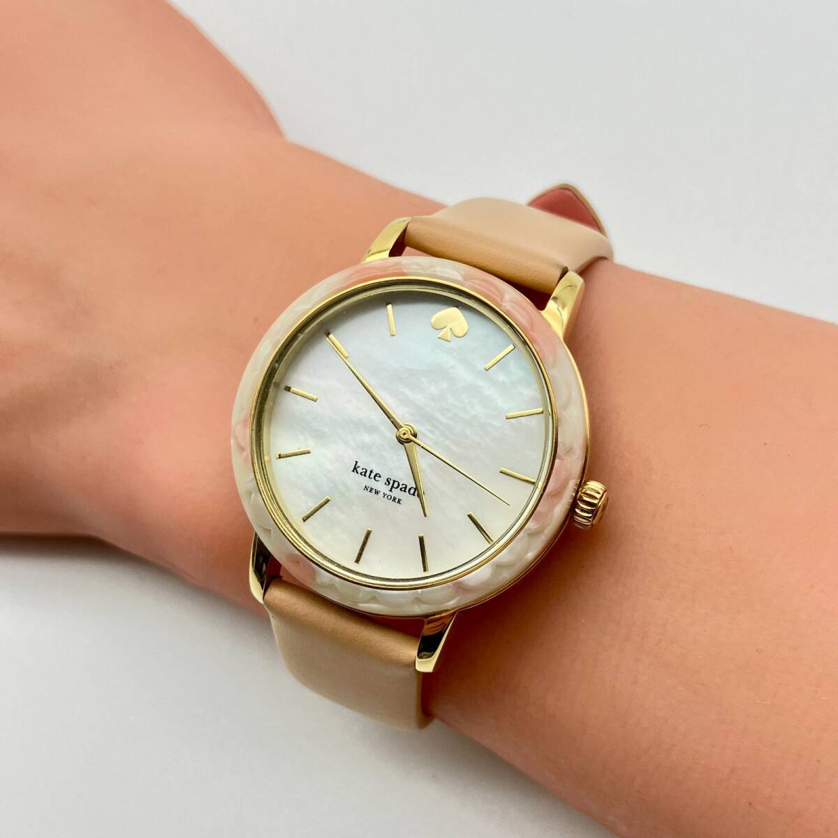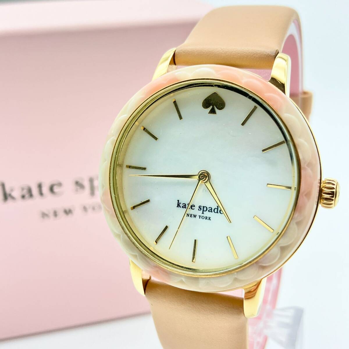 文字盤には光の加減で虹色に輝くホワイトシェル(マザーオブパール)を採用。12時位置にはブランドアイコンであるスペードマークがあしらわれ、シンプルながらも可愛らしいアクセントになっています。 ベルトは肌馴染みの良いピンクベージュのレザーを使用しており、手元を明るく上品に演出します。ケイトスペードらしい「スカラップ(波形)」デザインを取り入れた、女性らしさが詰まった一本です。