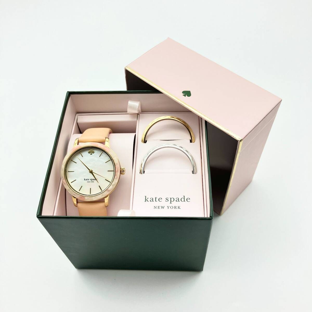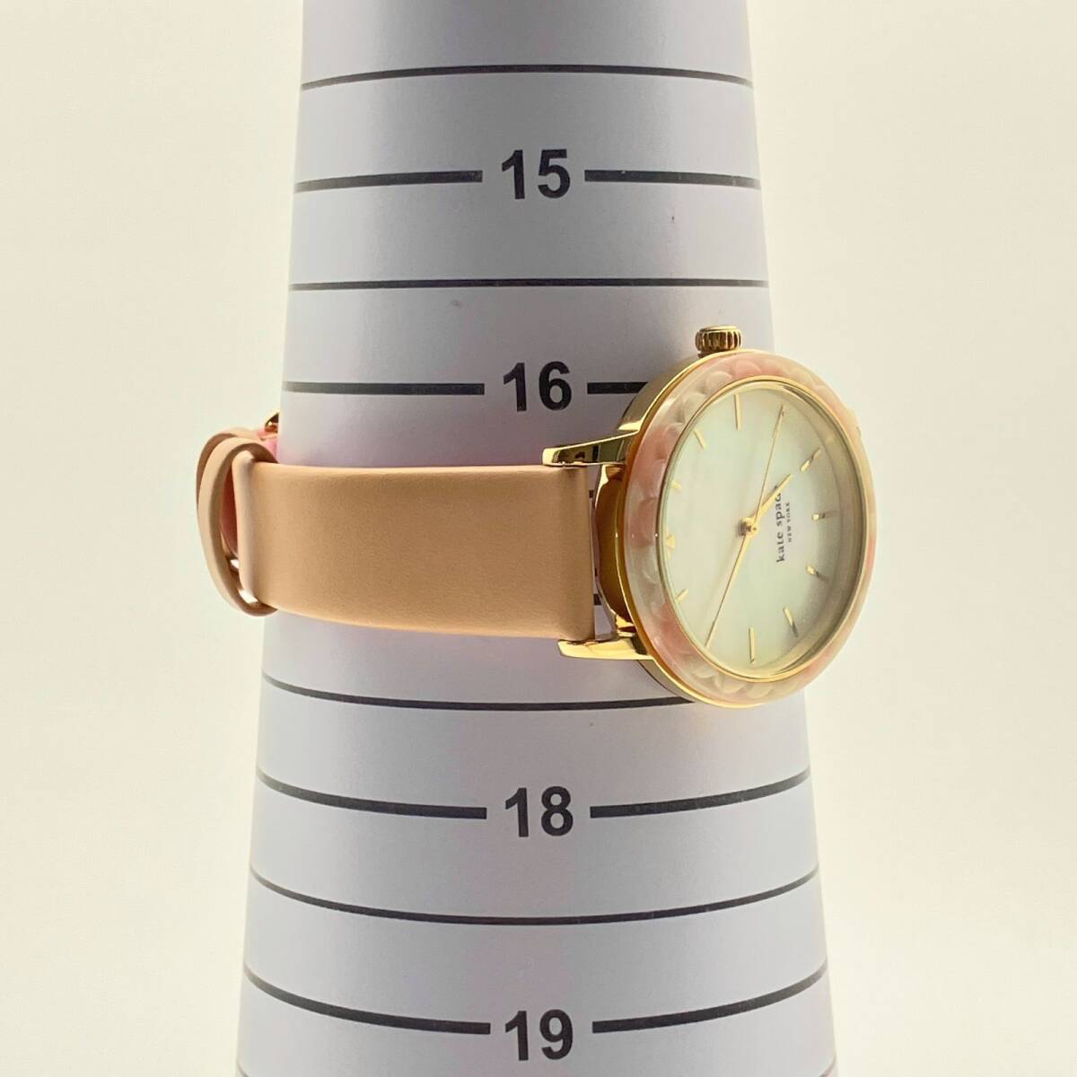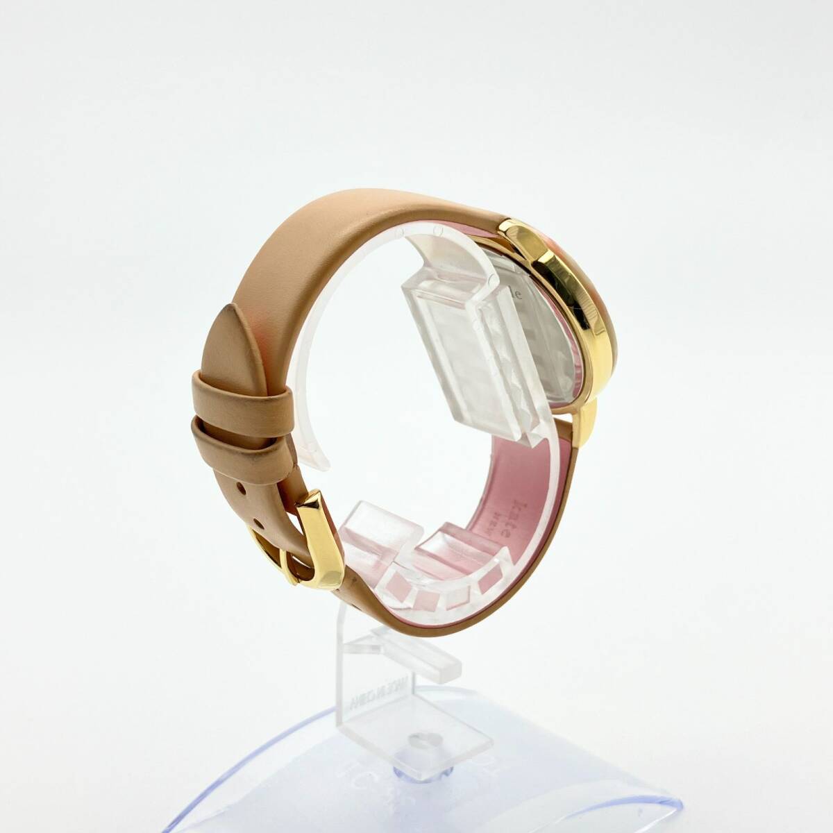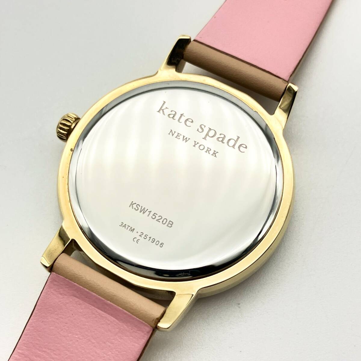 文字盤には光の加減で虹色に輝くホワイトシェル(マザーオブパール)を採用。12時位置にはブランドアイコンであるスペードマークがあしらわれ、シンプルながらも可愛らしいアクセントになっています。 ベルトは肌馴染みの良いピンクベージュのレザーを使用しており、手元を明るく上品に演出します。ケイトスペードらしい「スカラップ(波形)」デザインを取り入れた、女性らしさが詰まった一本です。