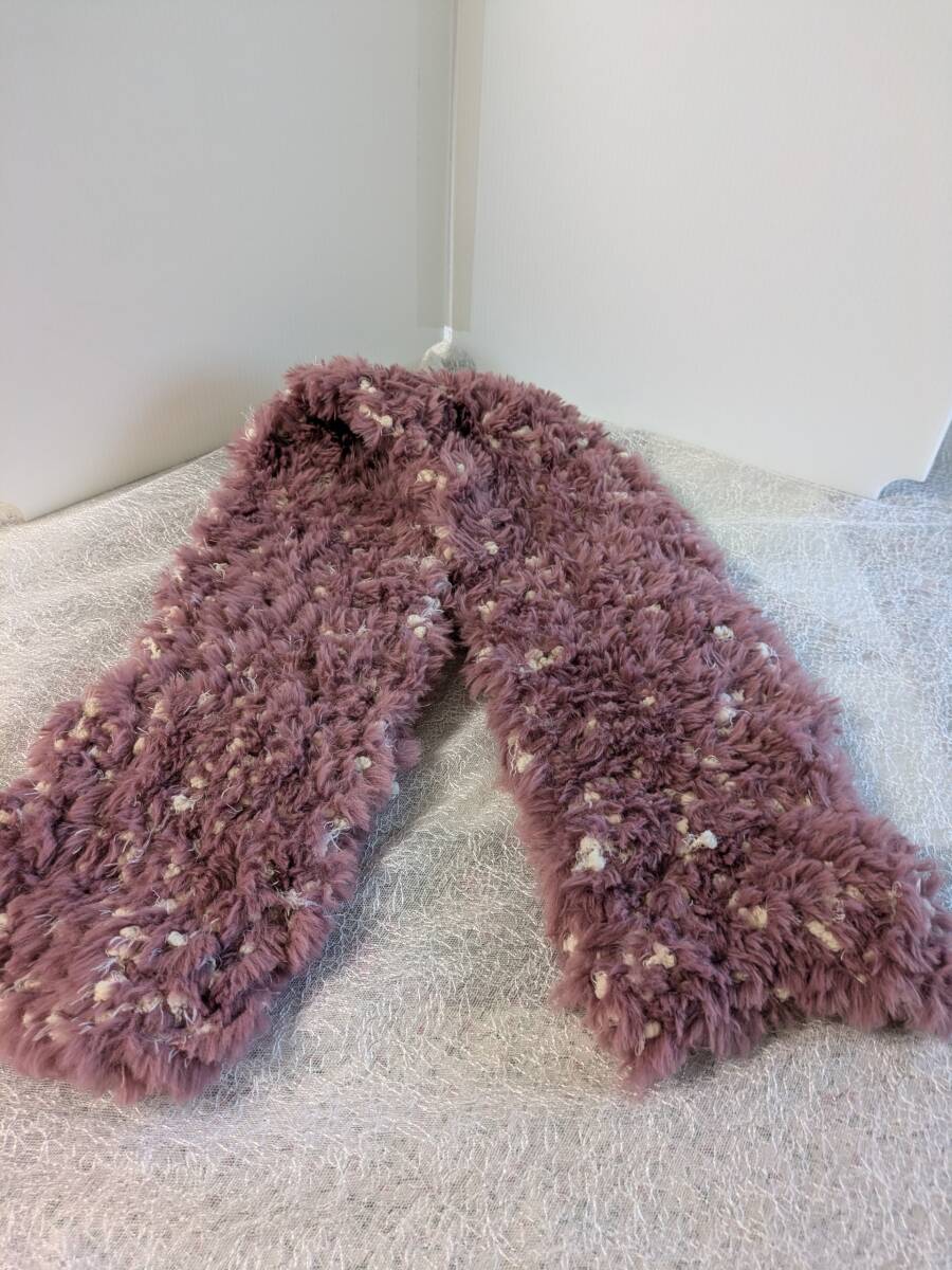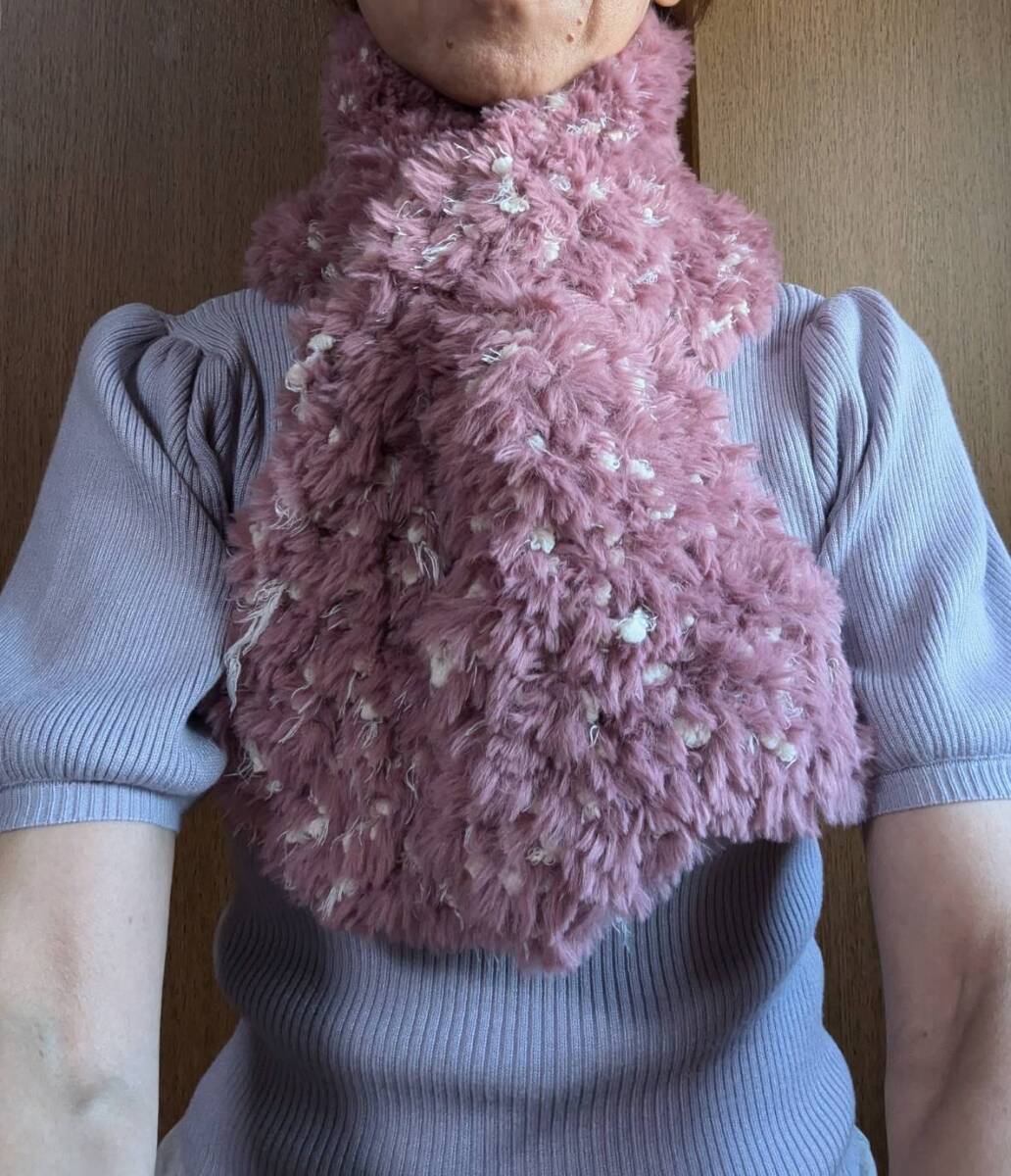 2種類の毛糸で編んでおり、とてもふわふわで、首に巻いているだけでとても暖かく、毎日使いたくなる可愛らしさです。