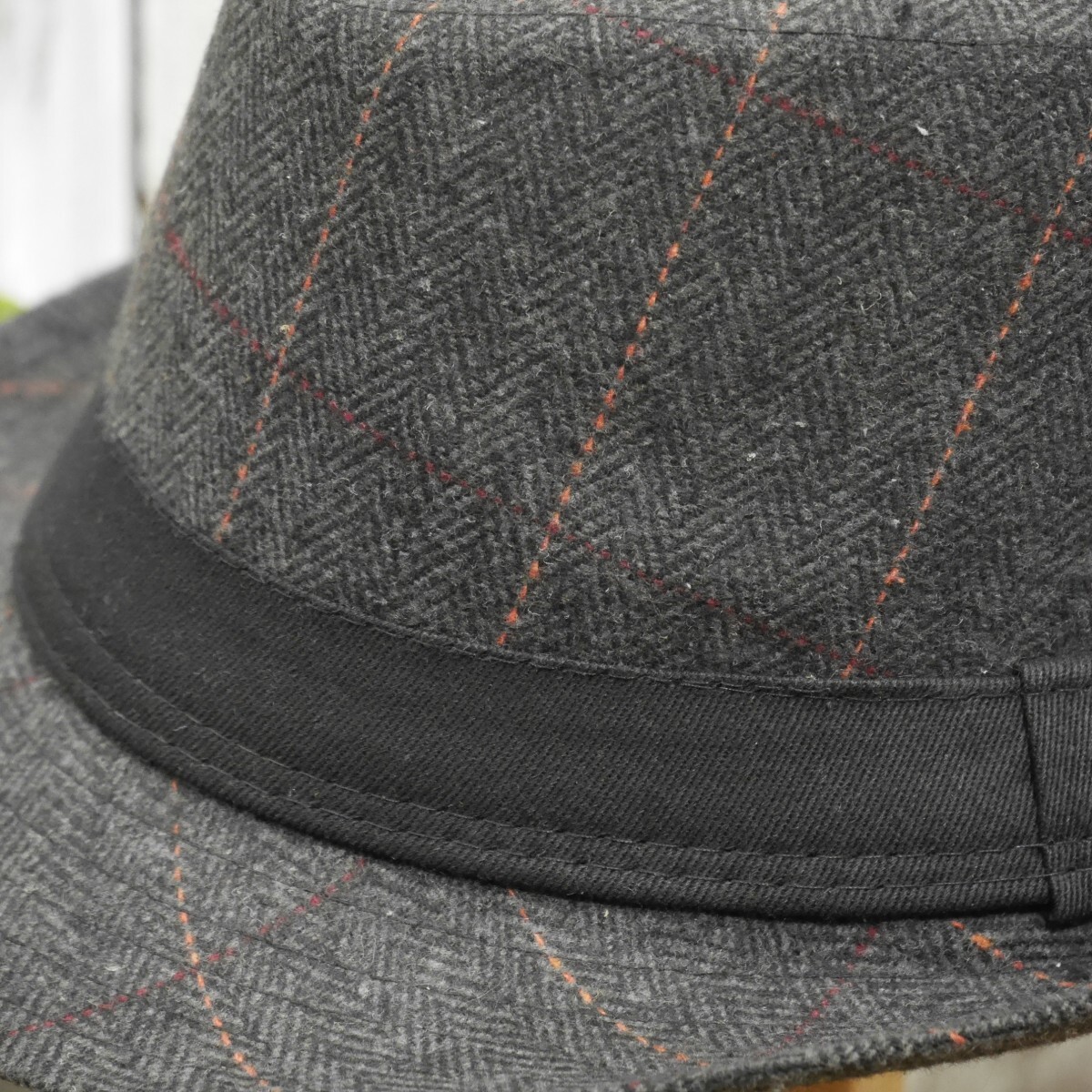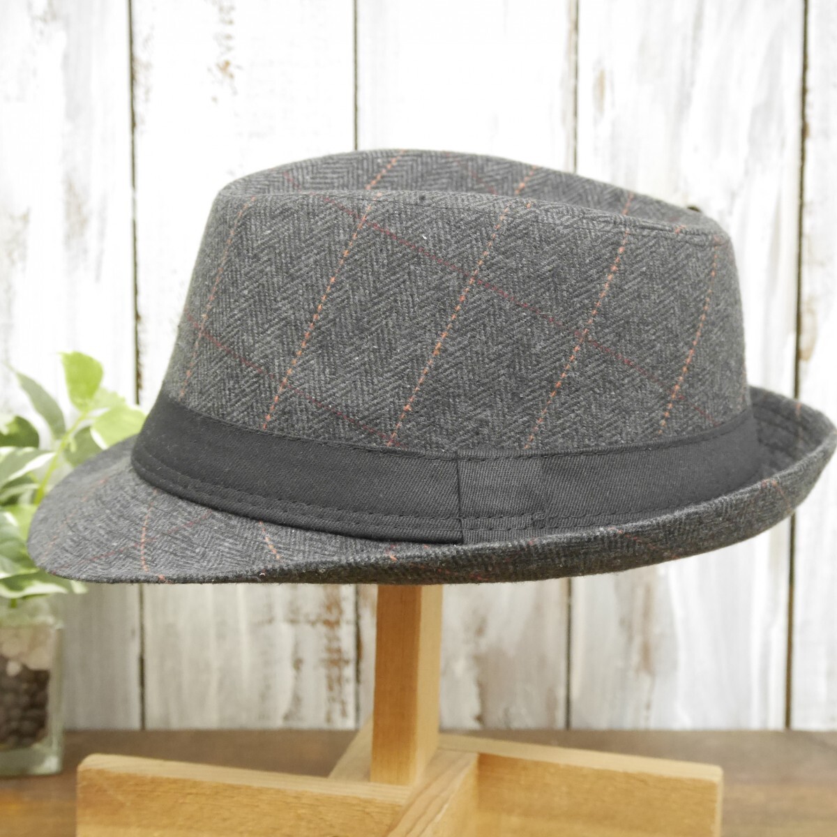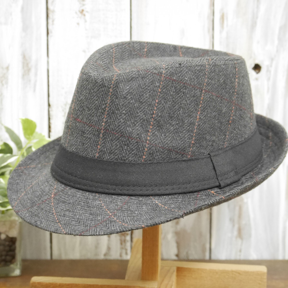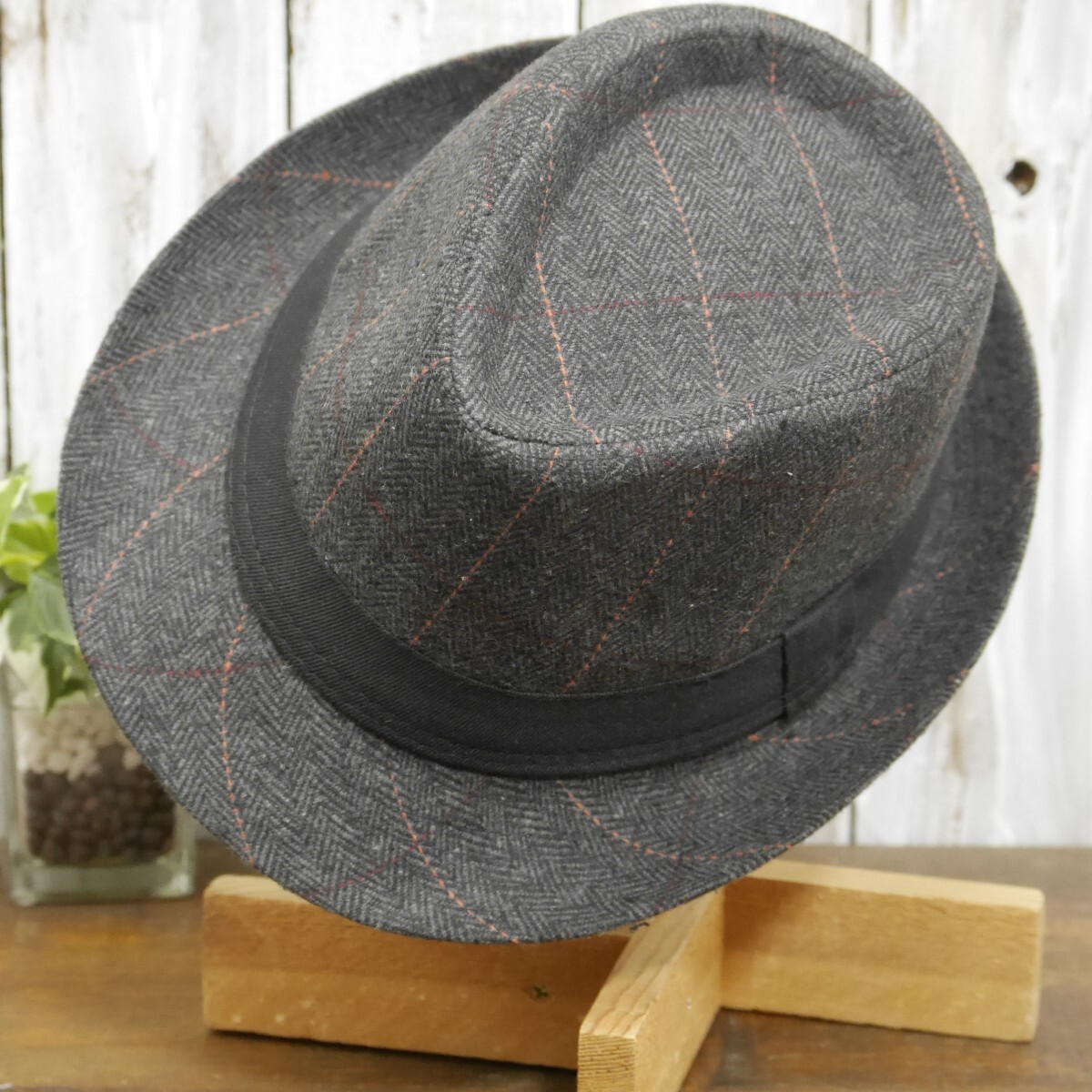 ウール風 チェック ヘリンボーン ブラック サイズ調整可 フェドラハット 中折れ 送料\450 男女兼用 ボルサリーノ パナマ