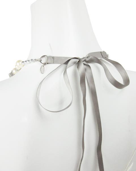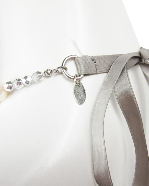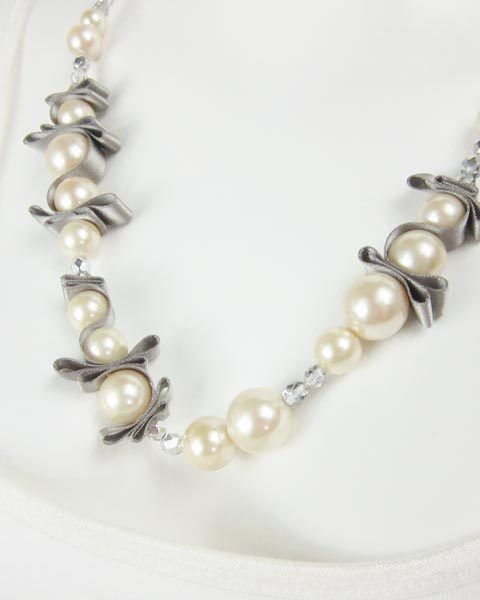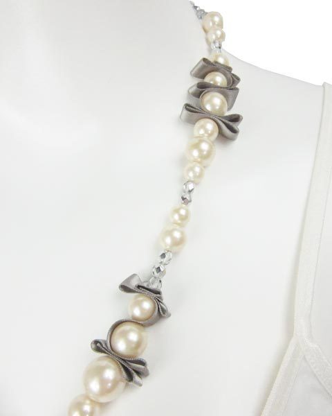 | 存在感のある華やかなネックレス。光沢のあるリボンやパール、クリアービーズ使いでちょっとしたパーティーなどにおススメです。キラキラしています。 |