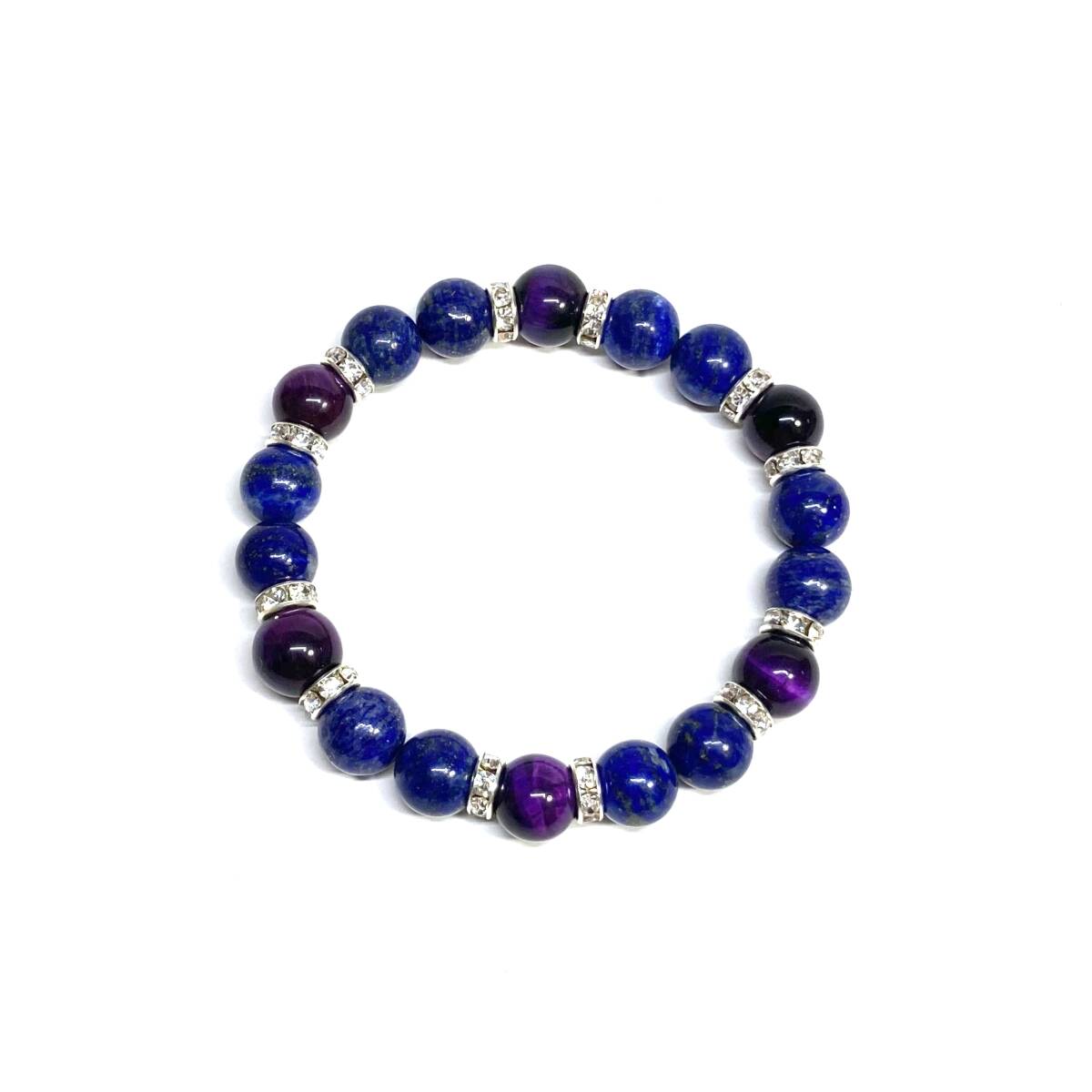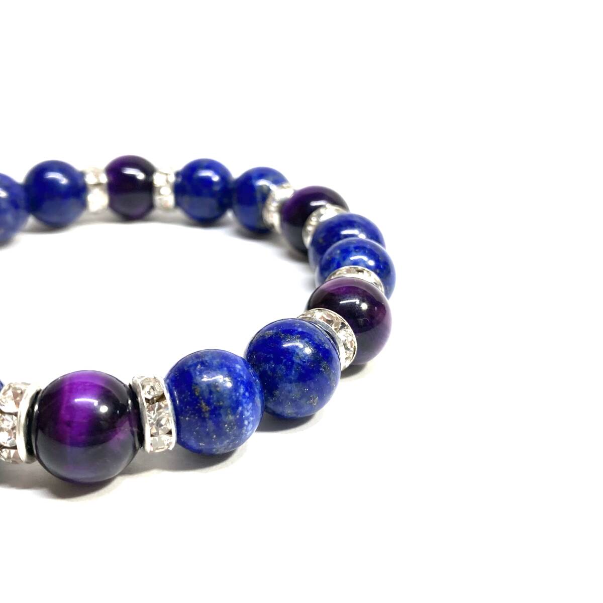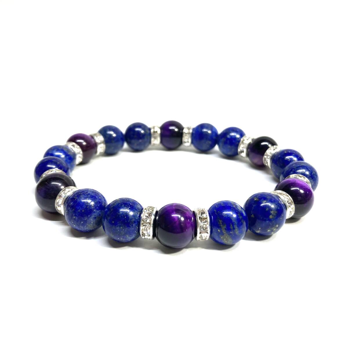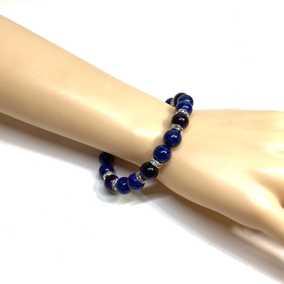 こちらは、ラピスラズリとパープル タイガーアイを組み合わせたパワーストーンブレスレットです。間にはロンデルを挟み高級感あるデザインに仕上げております。石大きさは腕にも馴染みやすいように10mm玉で内径約18cm(伸可能)です。(サイズ変更の場合は取引ナビにてご連絡をお願いします。) 数に限りがございますので気になる方はお早めにどうぞ。