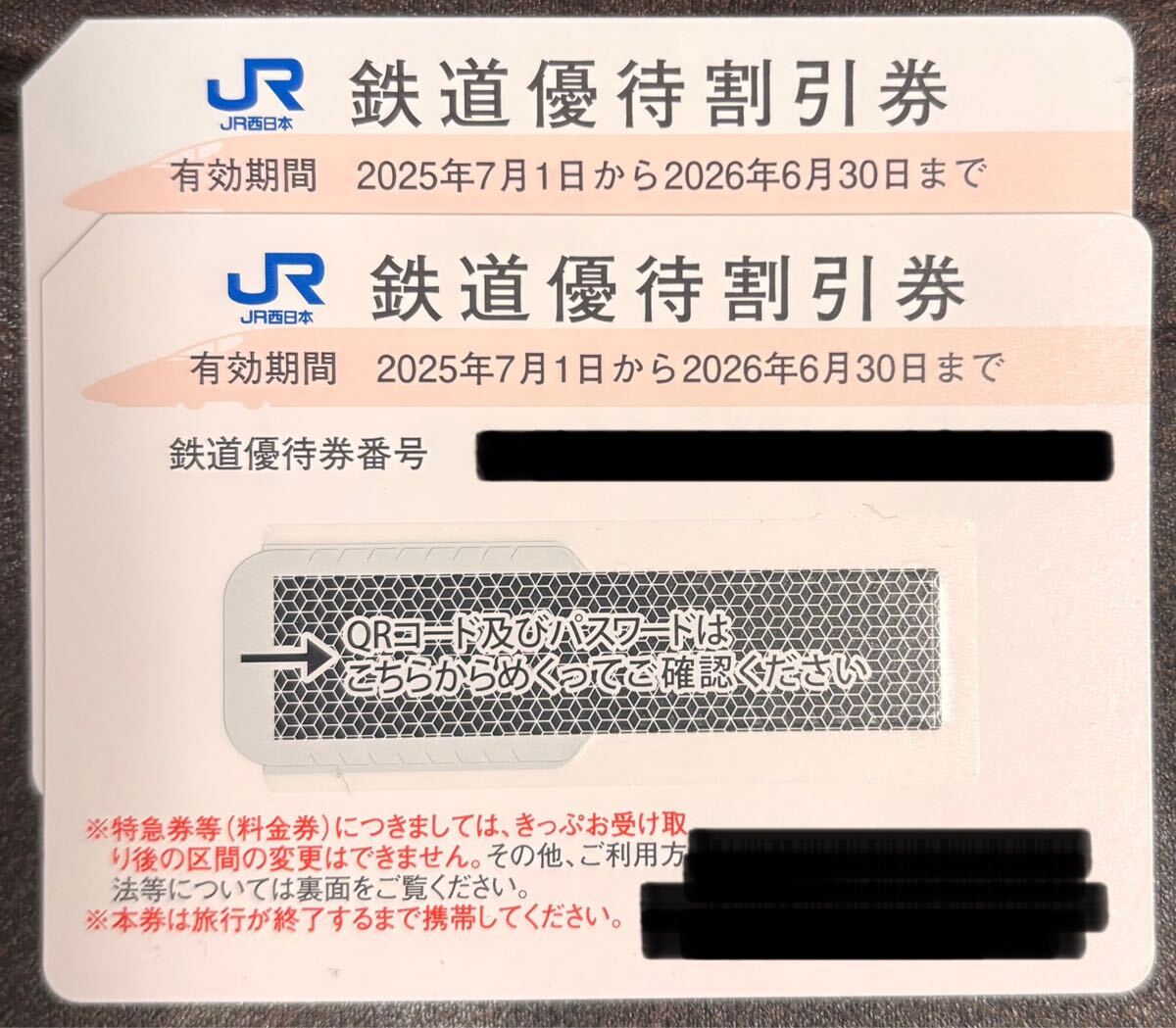 JR西日本管内のチケットが半額になる株主優待券2枚セットです。有効期限は2026年6月末まで。