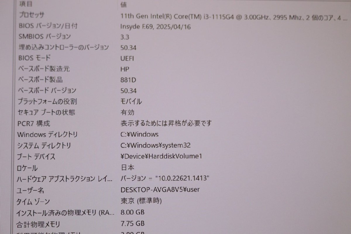 N 1【★i3第11世代★】HP /250 G8 / CPU:core i3-1115G4@3.00GHz / メモリ:8G / SSD:256G / Windows11 Pro