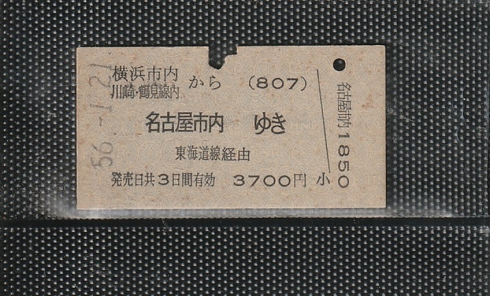 国鉄東京印刷 横浜市内・川崎鶴見線内から名古屋市内(コード907) 新横浜駅発行 A型 青地紋 硬券乗車券 上パンチ券