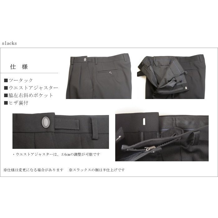 ■スラックス:ツータックアジャスター付、脇左右斜めポケット、後左右ポケット、ヒザ裏付