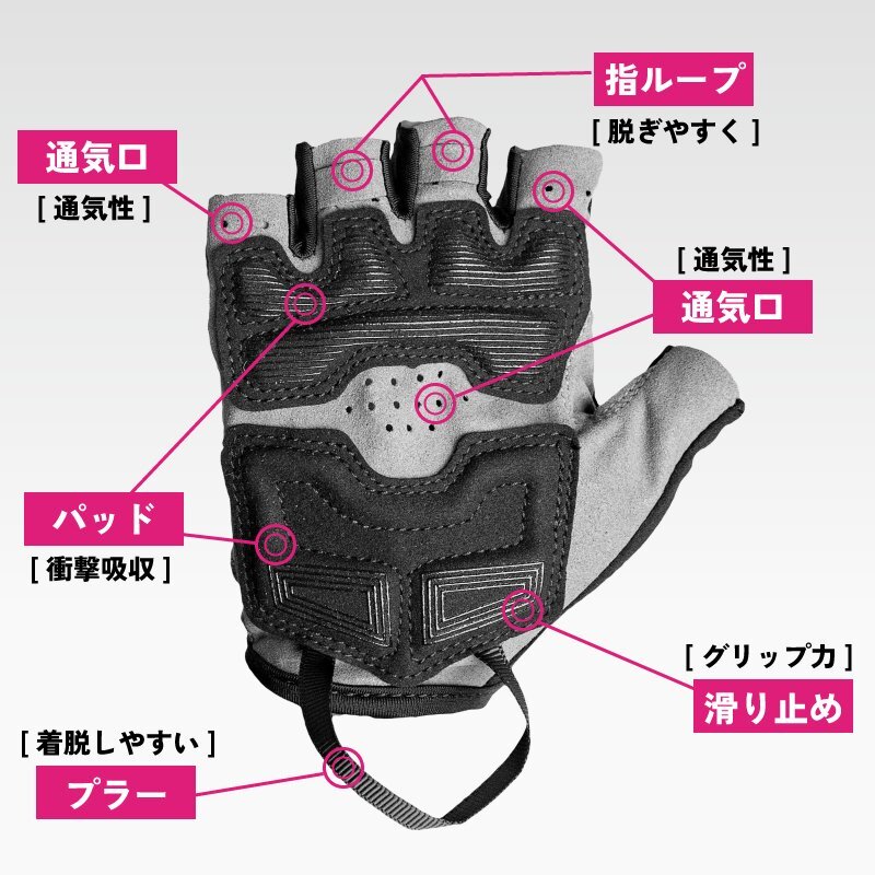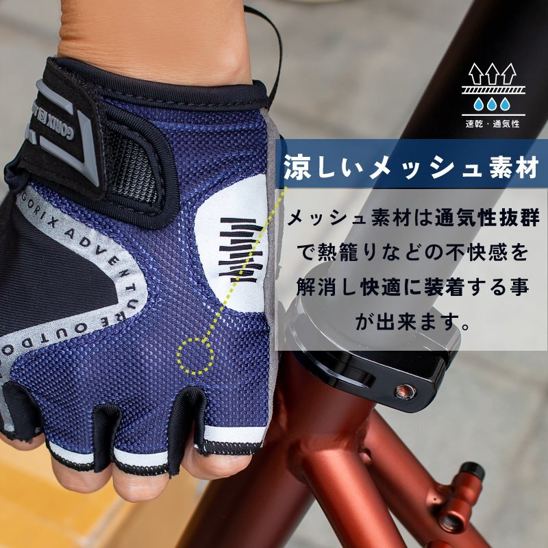 手の疲れや衝撃吸収のみならずサイクルグローブは転倒時の怪我防止にも有効なサイクルグローブ。 指切りハーフタイプで夏や春に活躍します。 手の甲はメッシュ素材で涼しく熱が籠らず快適です。 このグローブはパッドが厚いためロングライドにとても効果的です。 また自転車のみだけでなく筋トレなどのトレーニングや登山などにもお使い頂けます。 柔軟性・速乾性・伸縮性・耐久性を兼ね備えたサイクルグローブ。 自転車全般、ロードバイク、マウンテンバイク、クロスバイク、ミニベロ あらゆるスポーツ時にオススメの衝撃を和らげる自転車用サイクルグローブです。 [涼しいメッシュ素材] メッシュ素材は通気性抜群で熱籠りなどの不快感を解消し快適に装着する事が出来ます。 速乾性にも優れています。 [柔軟性・速乾性・伸縮性・耐久性] [厚めのパッド] 負荷のかかる場所に厚手のパッドを配置。 5-6mm厚のパッドは耐震3次元衝撃吸収EVAパッドを採用しハンドルからの衝撃を吸収し疲れを緩和します。 ハンドルとの接触部分で力が掛かりやすい位置にパッドを配置。 長時間のロングライドなどに効果的です。 [反射デザイン] 光に反射し夜間走行の安全性を高めます。 リフレクターは夜間走行の多いブルペや自転車通勤にも効果的。 [手の平] 通気口が複数あり通気性を向上させます。 また滑り止めがついているので、夏場でもしっかりと握ることができます。 [着脱] 手首プラーはサイクルグローブを着脱する時にとても便利な機能です。 また指ループは脱ぐ時に使うと通常よりも脱ぎやすくなります。 商品内容サイクルグローブ指切りタイプ 材質67% POLYAMIDE NYLON18% / POLYURETHANE8% / POLYESTER7% /SPANDEX /EVAパッド | |