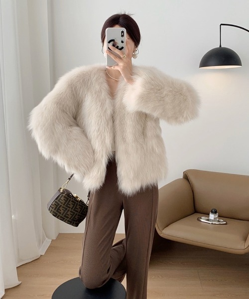 参考商品名:ノーカラー ショート丈 フェイクファーコート