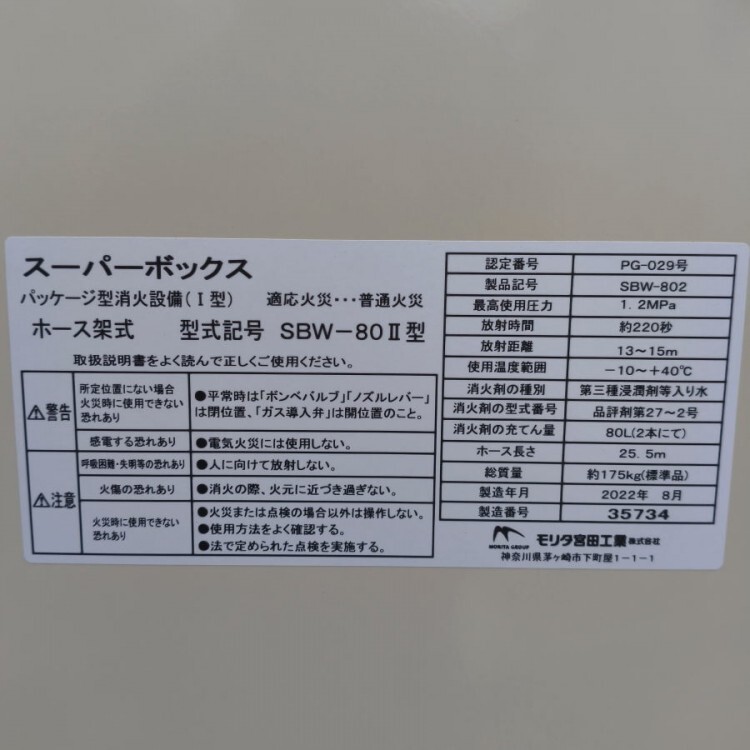 | 管理番号:1100000117297 メーカー:モリタ宮田工業 型番:SBW-80II型 規格・仕様: 【仕様】 ・最高使用圧力:1.2MPa ・放射時間:約220秒 ・放射距離:13~15m ・使用温度範囲:-10~+40℃ ・消火剤の種別:第三種浸潤剤等入り水 ・消火剤の充てん量:80L(2本にて) ・ホースの長さ:25.5m ・総重量:約175kg ・製造年月:2022年8月 詳細備考: ・未使用長期保管品です。 ・長期保管による変色、小キズや細かな塗装剥がれがございます。 ・機器点検は令和6年9月まで行われておりました。 ・有効期限は2043年になります。 ※同程度の商品を複数在庫していますので商品写真は併用しております。 商品は写真に写っているもので全てです。(※背景などにある無関係の物は含まず) 他に付属品はありません。 ご質問はお気軽にどうぞ。分かる範囲でお答えします!! ※上記は型番などから調べたデータを抜粋したものです。 |