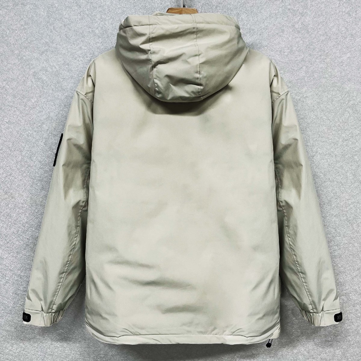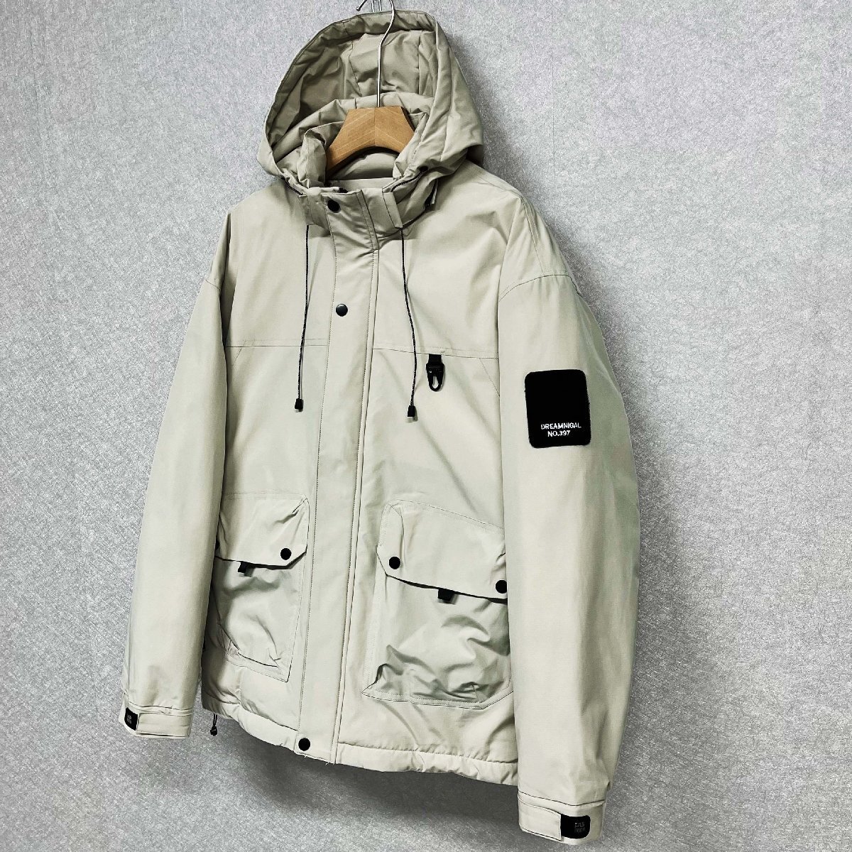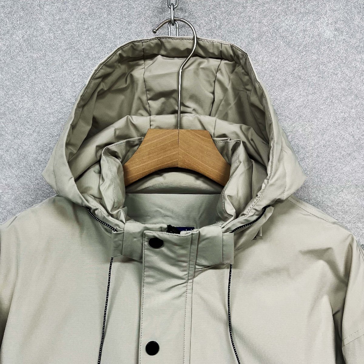 全体はどんな服にも合わせやすいベーシックカラーでまとめ、清潔感と落ち着いた印象を演出。左袖には存在感のある刺繍ワッペンをあしらい、シンプルな中にも個性をプラスしています。フードには調節可能なドローコードを備え、冷たい風をしっかりシャットアウト。前面の大容量ポケットは、スマホや小物を収納するのに便利です。