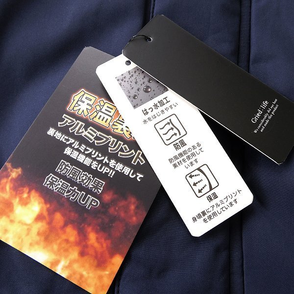 | 新品 未使用 紙タグあり LLサイズ 胸囲104~112 身長175~185 ※写真は別サイズを使用している場合がございます※ ※商品に記載されたサイズ・寸法です※ ラグランのため肩幅計測不可 ゆき丈90cm(首裏~袖先) 身幅64cm 袖下丈55cm(脇下~袖先) 着丈71cm 表地:ポリエステル100% 裏地:ポリエステル100 (身頃裏:アルミプリント) 中わた:ポリエステル100% ネイビー |
