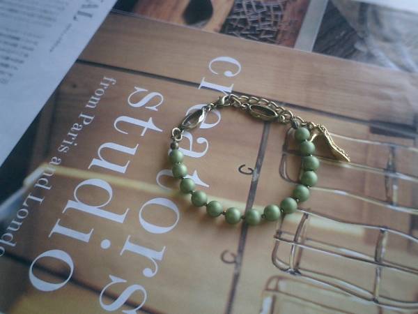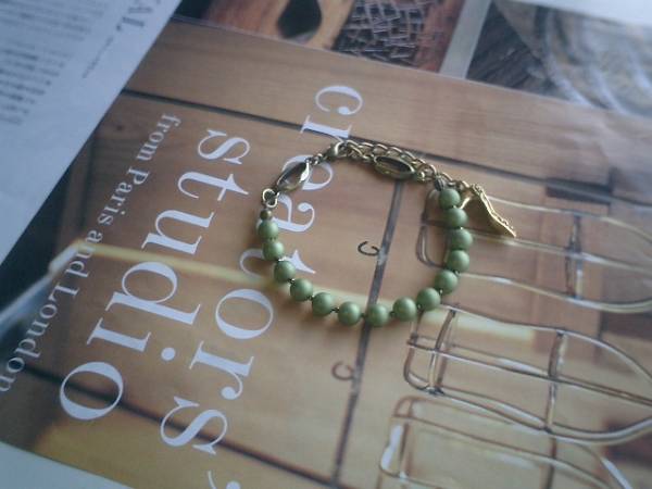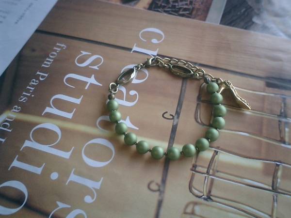 秋色アート・・シリーズです♪美術館への招待・・シックなマットグリーンの樹脂パールのブレスレットです♪6ミリの丸玉のパールにクラシカルなデザインチェーンを合わせてアンティーク・モダンな表情です♪♪長さは全長23センチ位で調節自由です♪お揃いのネックレスやイヤリングも出品しています♪シンプルで飽きのこないいつまでも着けられるデザインを考えて作りました!ハンドメイドをご理解頂いてノークレーム、ノーリターンでお願いします