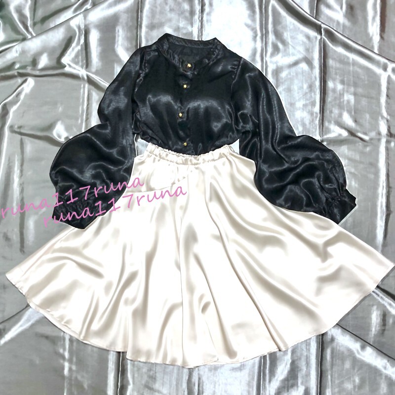 超光沢サテンのブラウスとスカートです♪ 袖のシルエットを変更できる2wayブラウス♪ スカートに色うつりしてしまったところが数カ所ございます。 それでもいいよって思ってくれる方お願いします♪